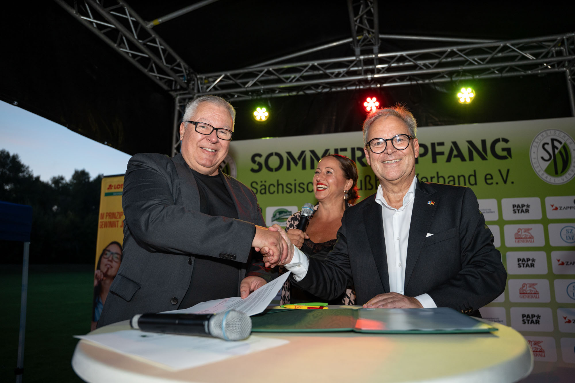 Ganz offiziell wurde auch die Kooperation zwischen SFV und AOK PLUS verlängert. Dr. Stefan Knupfer und Hermann Winkler unterzeichneten auf der Bühne den neuen Vertrag und besiegelten damit die Partnerschaft. Seit vielen Jahren ist die AOK PLUS Gesundheitspartner des SFV und fördert insbesondere den Nachwuchs.