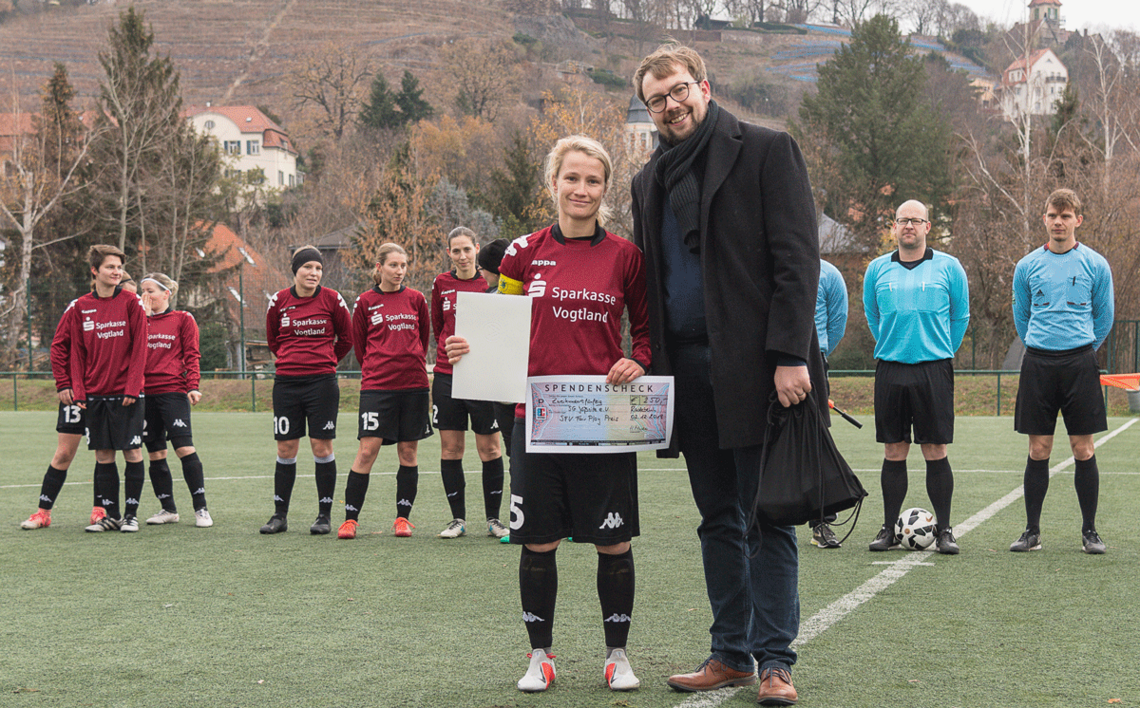 Für die SG Jößnitz reichte es am letzten Sonntag in Radebeul zwar wieder nicht für einen Punktgewinn (1:2), dafür hatte SFV-Vizepräsident Christoph Kutschker als Anerkennung der Fair Play-Aktion aber einen Scheck in Höhe von 250,- € für die Jößnitzer Mannschaftskasse im Gepäck, den er vor dem Anpfiff Christiane Gotte überreichte. Auch er betonte noch einmal die Bedeutung von Fair Play Gesten: "Christiane Gotte hat mit ihrer Aktion gezeigt, dass es wichtigere Dinge als den sportlichen Erfolg gibt. Mit ihrer Entscheidung, den Schiedsrichter auf seine falsche Einschätzung hinzuweisen, hat sie beispielhaft gehandelt. Der respekvolle und faire Umgang miteinander sollte eine Selbstverständlichkeit sein."