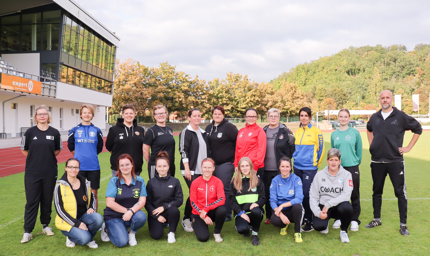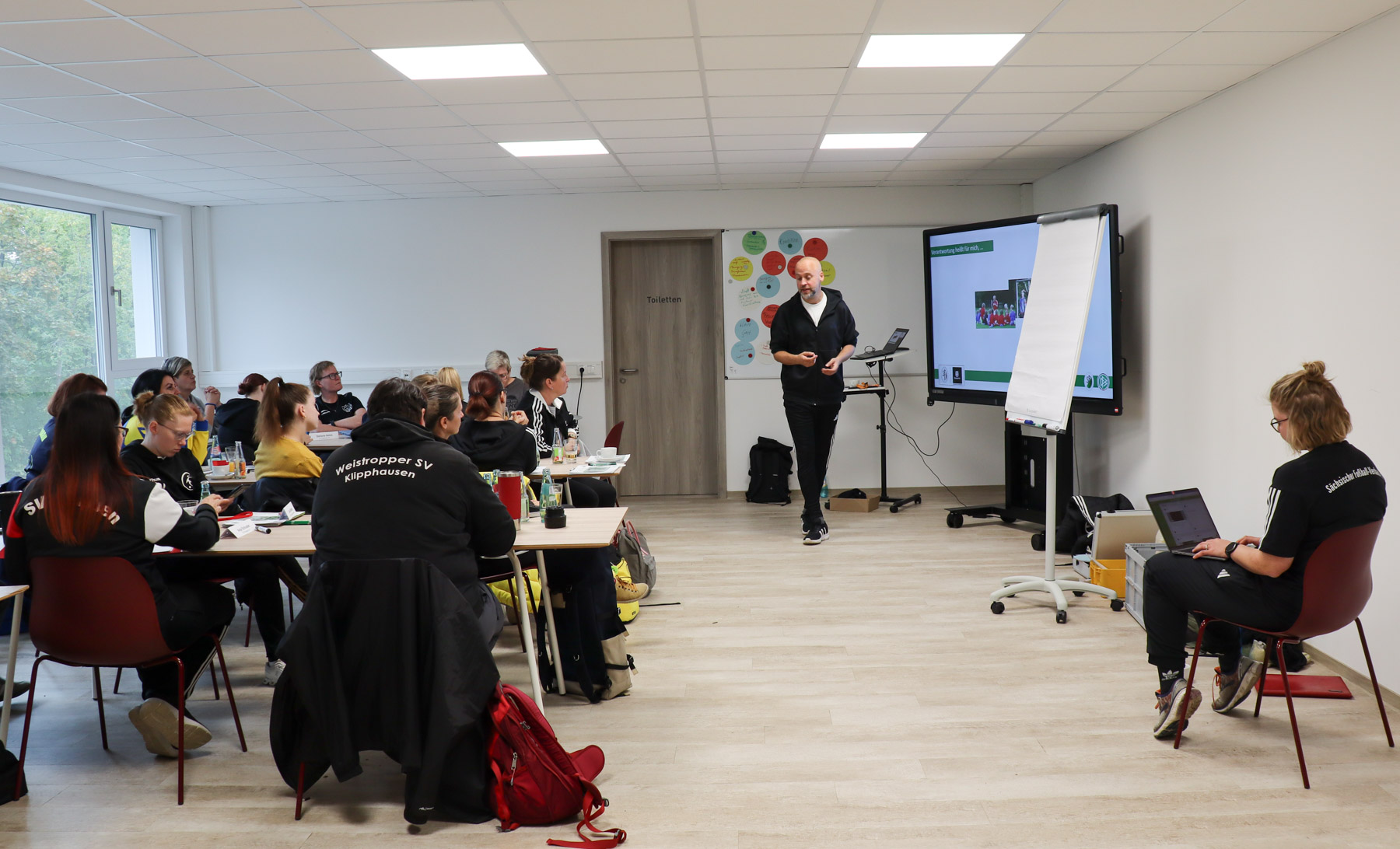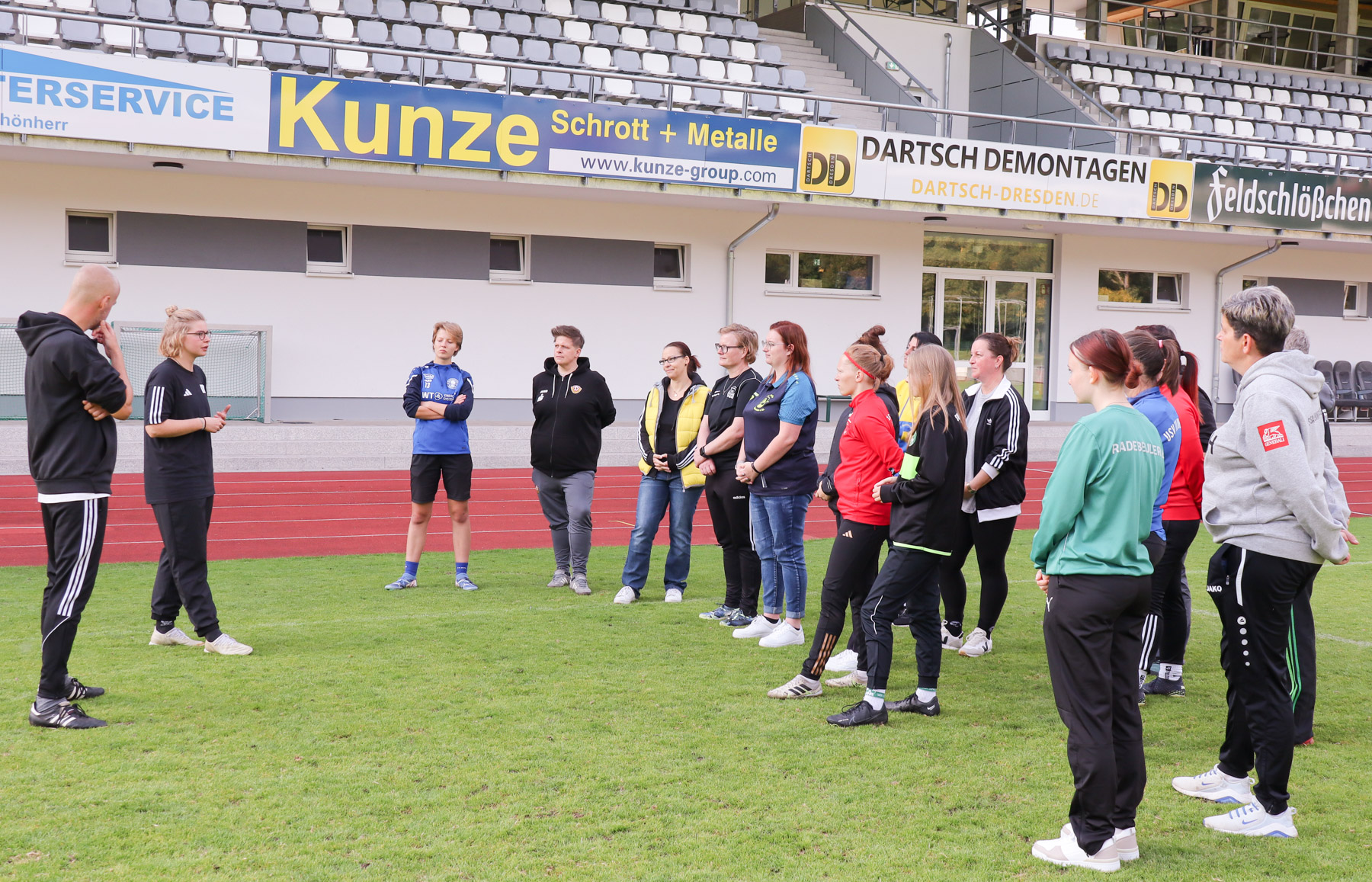 Diesmal fand die Veranstaltung in der WGF-Arena des SC Freital statt. Die 18 Teilnehmerinnen, die von den Bambinis bis zu den Frauen bereits Mannschaften betreuen, haben unter hervorragenden Bedingungen und ausgezeichneter Verpflegung ihre zweite Präsenzphase also beim SC Freital absolviert und stehen kurz vor dem erfolgreichen Abschluss des Lehrgangs. Der Basis Coach Lehrgang setzt sich aus Präsenz- (3 Tage), Online- und Anwendungsphasen im Verein zusammen.