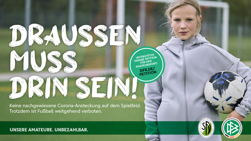 Die aktuelle DFB-Kampagne und die Petition sollen dabei einen wichtigen Schritt markieren. Neben umfassenden Aktivitäten im Online- und Social-Media-Bereich sollen in den kommenden Tagen unter anderem ausgewählte Standorte in Berlin vorübergehend plakatiert werden. Beim DFB-Pokalfinale am Donnerstag wird ein Riesenbanner auf der Gegentribüne im Berliner Olympiastadion für die Aktion werben. Die Petition für den Amateur- und Breitensport läuft drei Wochen.