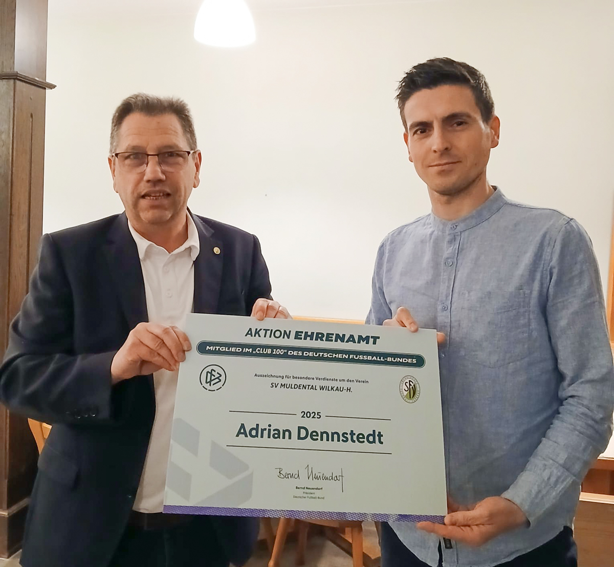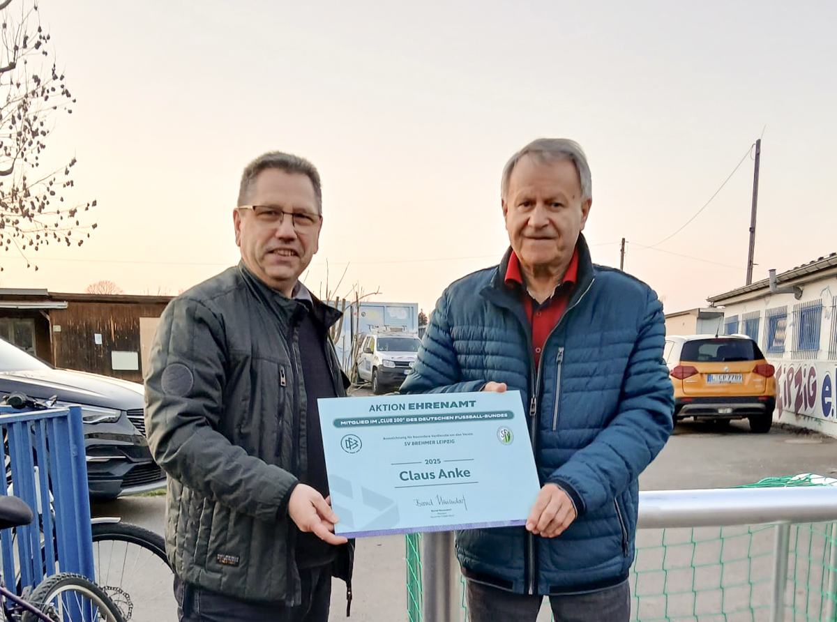 Aus bundesweit allen Kreissiegern werden zusätzlich die einhundert engagiertesten Ehrenamtlichen ausgewählt und für ein Jahr in den "Club 100" des DFB aufgenommen. Der „Club 100“ ist eine Initiative zur Anerkennung besonders engagierter Ehrenamtlicher im Fußball. Diese erwartet die Einladung zur offiziellen DFB-Ehrungsveranstaltung im deutschen Fußballmuseum vom 17. - 19. April in Dortmund. SFV-Vizepräsident Jörg Gernhardt hat in den letzten Wochen vier engagierte Persönlichkeiten als neue sächsische Mitglieder des „Club 100“ ausgezeichnet und war dafür direkt in den Heimatvereinen. Zu den Geehrten zählt Claus Anke vom SV Brehmer Leipzig, Nicole Reuschel vom SV Roland Belgern, Adrian Dennstedt vom SV Muldental Wilkau-Haßlau und Frank Marschner von der BSG Sohland-Oppach.