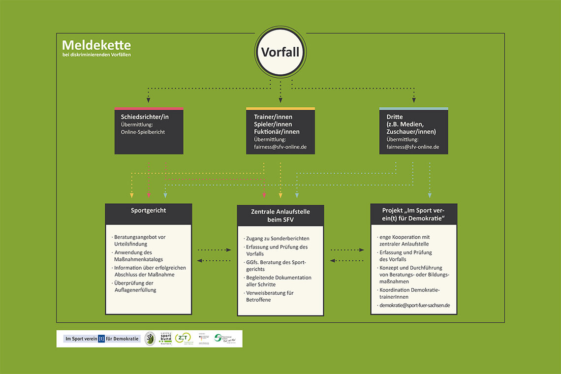 Auch der Sächsische Fußball-Verband möchte für einen Fußball ohne menschenverachtende und diskriminierende Verhaltensweisen werben. Dreh- und Angelpunkt sind unsere Schiedsrichterinnen und Schiedsrichter, die die Vorfälle im elektronischen Spielbericht vermerken müssen. Unsere Mitarbeiterin Laura Holzapfel, die für die Aufarbeitung demokratiefeindlicher Tendenzen zuständig ist, steht im weiteren Prozess im Austausch mit den Staffelleiterinnen und Staffelleitern und ggfs. auch mit den Sportrichterinnen und Sportrichtern.