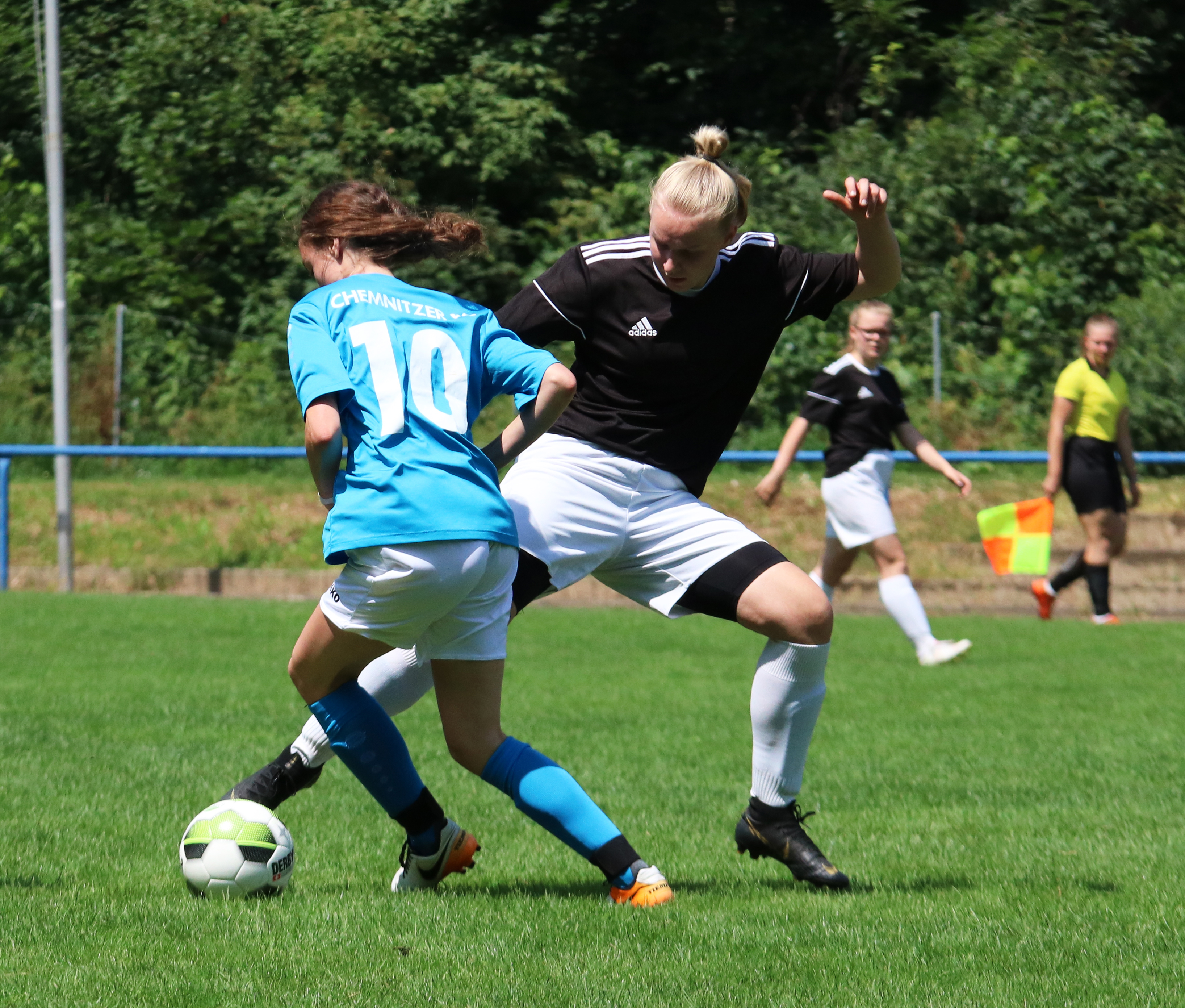 Währenddessen fielen auf Platz 2 im Halbfinale zwischen dem Chemnitzer FC und den D-Juniorinnen von RasenBallsport Leipzig weit weniger Tore, die Spannung jedoch war umso höher. Als es kurz vor Schluss immer noch 1:1 stand, warfen die Leipzigerinnen noch einmal alles nach vorn, vergaben aber ihre guten Torchancen gegen aufopferungsvoll kämpfende Chemnitzerinnen. Die Heldin im anschließenden Elfmeterschießen war Charlotte Veit. Gleich zweimal hechtete die Chemnitzer Torhüterin in die richtige Ecke und sicherte ihren Mädels damit den Einzug ins Finale.
