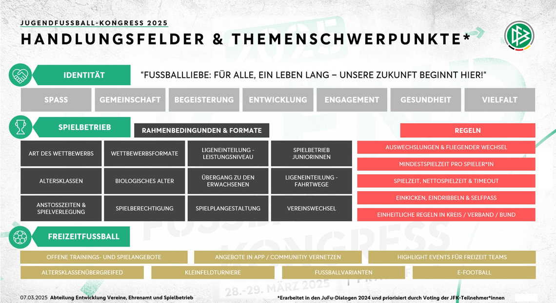 Am vergangenen Wochenende stand der DFB Jugendfußball-Kongress 2025 auf dem DFB Campus in Frankfurt (Main) an. Hauptgedanke an dieser Veranstaltung ist, gemeinsam mit allen 21 Landesverbänden eine Leitlinie zu entwerfen, wie man auf vor allem die DropOut-Quote im D- bis A-Juniorenbereich senken kann.