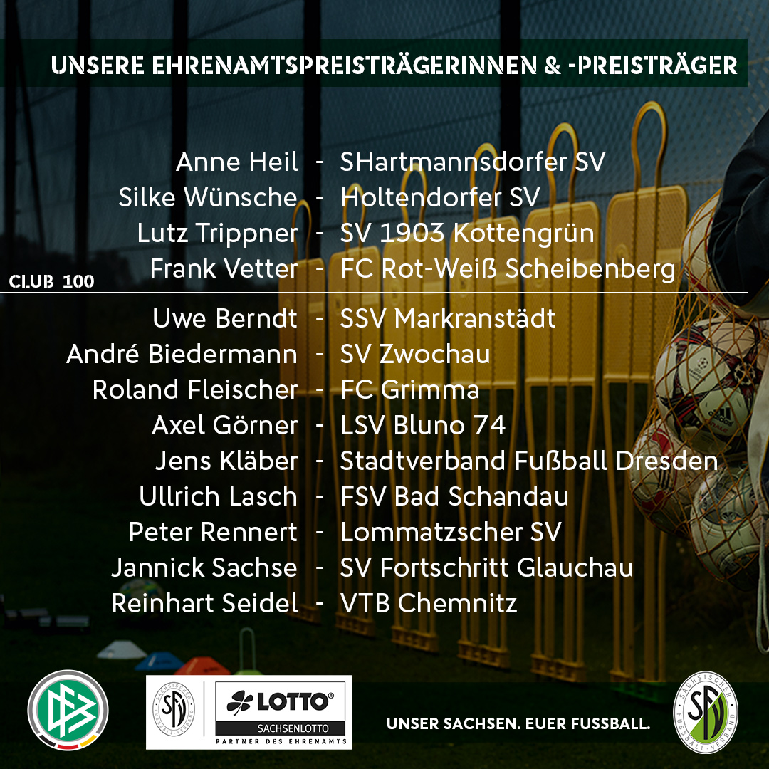 Die DFB-Ehrenamtspreisträger aus Westfalen (FLVW), Berlin (BFV) und Sachsen (SFV) wurden, im Rahmen des Dankeschön-Wochenendes, für ihre ehrenamtlichen Verdienste im Fußball und ihr Engagement im Verein ausgezeichnet. Der DFB-Ehrenamtspreis wird jährlich in Zusammenarbeit mit den Landesverbänden verliehen und zeichnet diejenigen aus, ohne die in den Vereinen oftmals nichts geht - die ehrenamtlichen Helfer und Helferinnen.