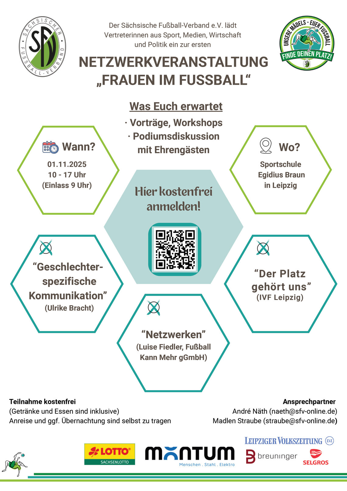 Im Rahmen unserer Strategie „Unsere Mädels – Euer Fußball“ wollen wir nicht nur die Anzahl weiblicher Akteurinnen im Fußball in Sachsen erhöhen, sondern ihnen auch den Raum für Austausch und persönlicher Weiterbildung bieten. Genau darauf dürfen sich alle Teilnehmerinen der Netzwerkveranstaltung freuen. Es wird Vorträge (u.a. Sabine Eger, adidas AG), Workshops, eine Podiumsdiskussion und natürlich genügend Zeit zum Netzwerken geben.
