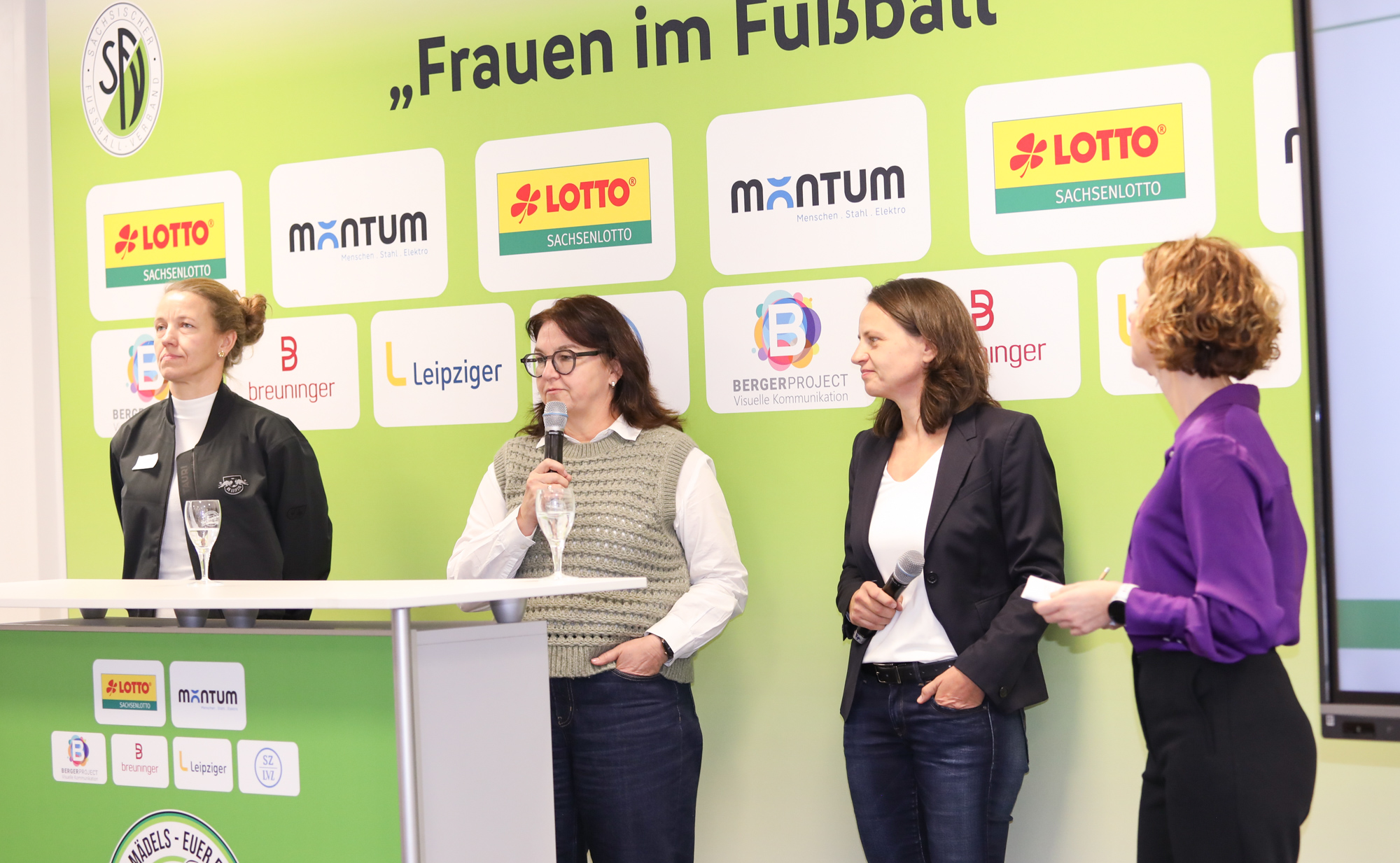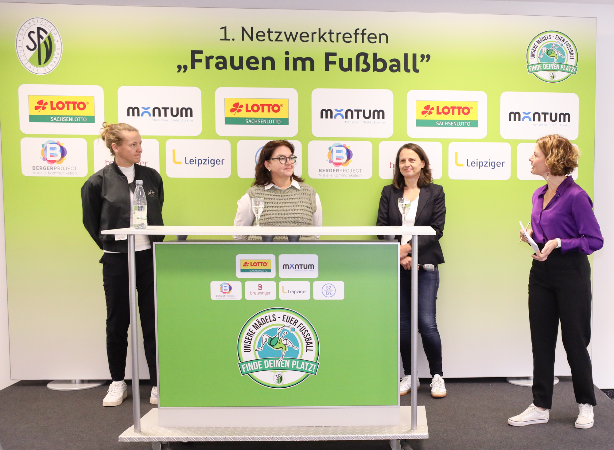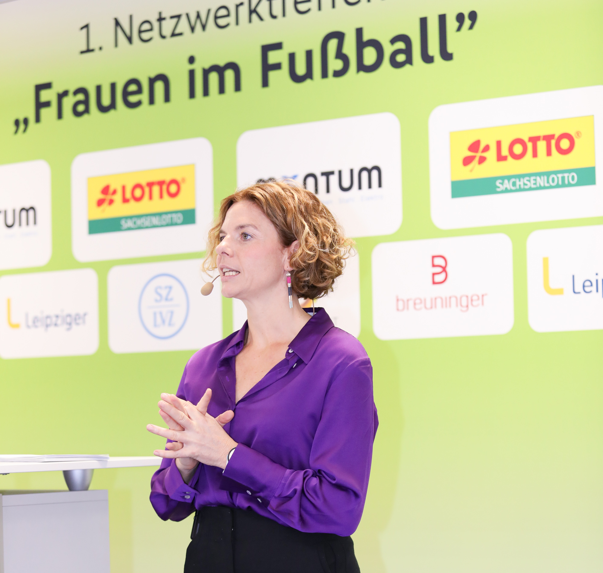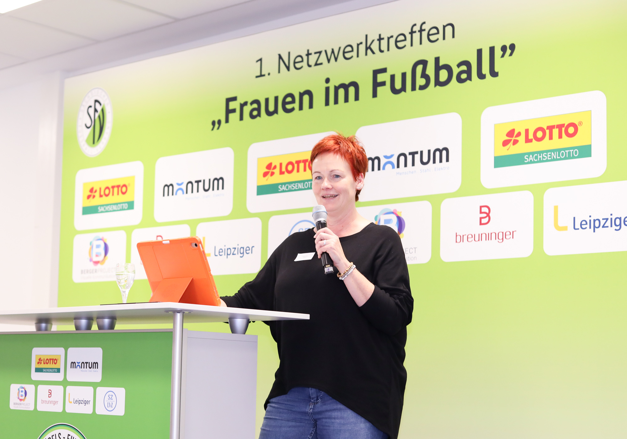 Das Programm war vollgepackt. Nach Impulsvorträgen zur neuen SFV Frauen- und Mädchenstrategie von Madlen Straube und der weiblichen Talentförderung von Katja Greulich und Sophie Mörtlbauer in Sachsen, begrüßte Moderatorin Yvonne Oswald Heike Ullrich (DFB-Generalsekretärin), Viola Odebrecht (Leiterin Frauen- und Mädchenfußball RB Leipzig) und Anja Kunick (ehem. FIFA-Schiedsrichterin) zum Tageshöhepunkt auf der Bühne. Die drei Frauen mit erfolgreichen Karrieren im Fußball blickten auf ihre Laufbahnen zurück, bei der alle die ein oder andere Hürde meistern mussten. Heike Ullrich, die beim DFB-Bundestag am 7. November als Vizepräsidentin kandidiert, sagt: „Wir sind mit 1,5 Millionen weiblichen Mitgliedern zwar auf einem guten Weg und haben auch beim DFB wegweisende Entscheidungen getroffen, allerdings muss es uns noch besser gelingen, vor allem im ländlichen Raum allen Mädchen und Frauen den Zugang zum Fußball in jedem Alter zu ermöglichen. Ich opfere nicht meine Zeit, ich investiere sie. Man braucht einen Antrieb, etwas gestalten zu wollen. Ich möchte Verantwortung übernehmen. 99.5 % der Mitglieder sind im Amateurfußball zu Hause. Das müssen wir uns bewusst machen und auch da müssen wir weiter ansetzen. Gerade mit Kampagnen wie DFB-Assist.“