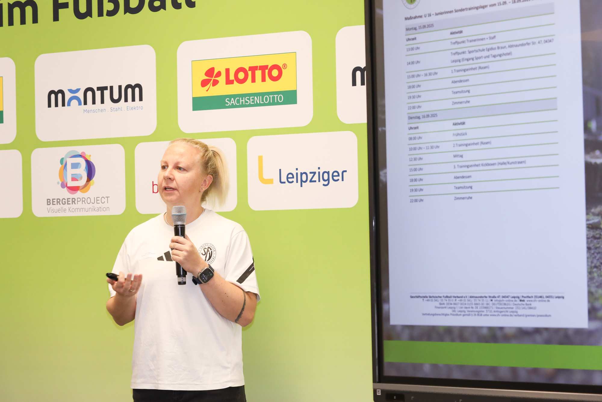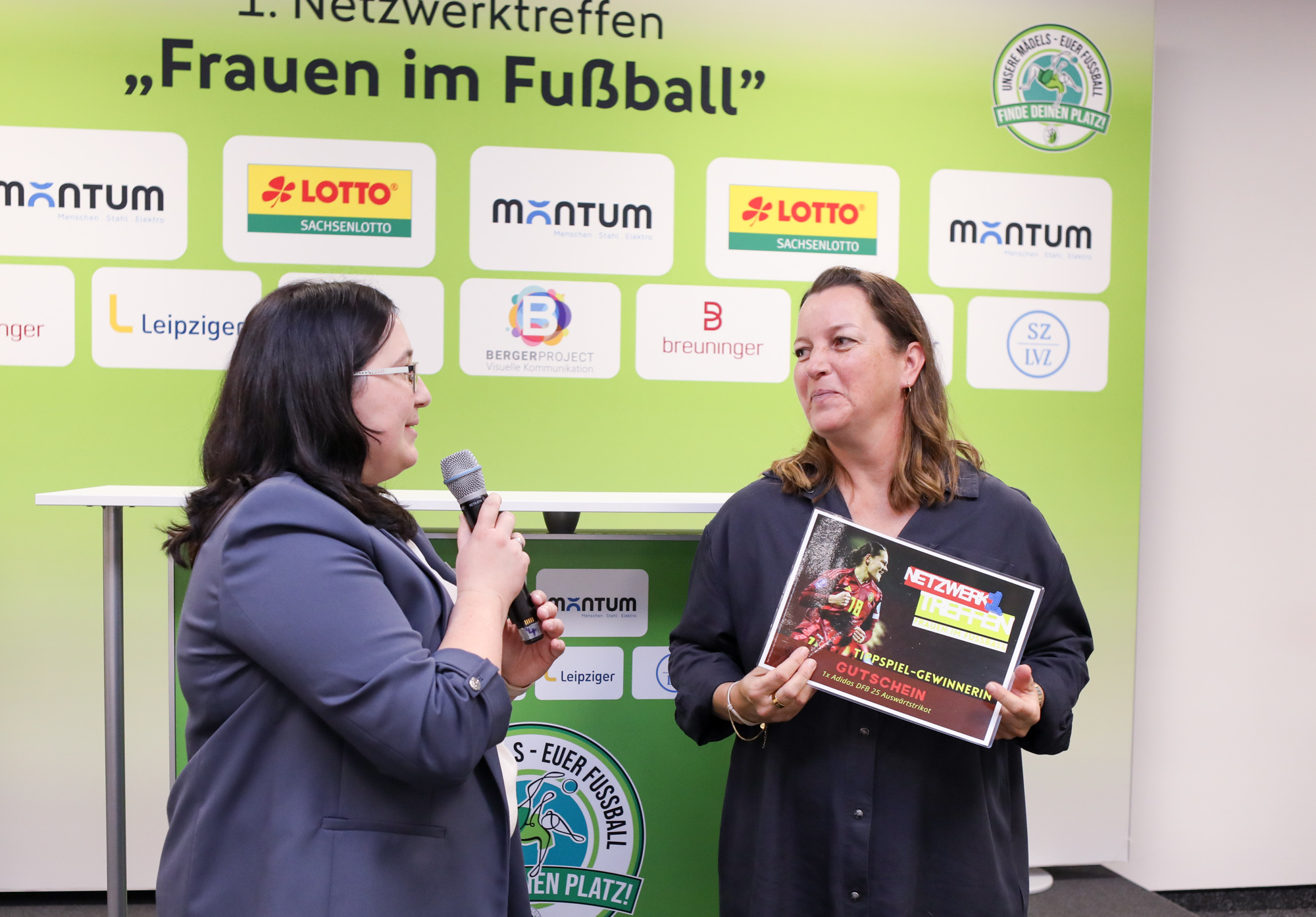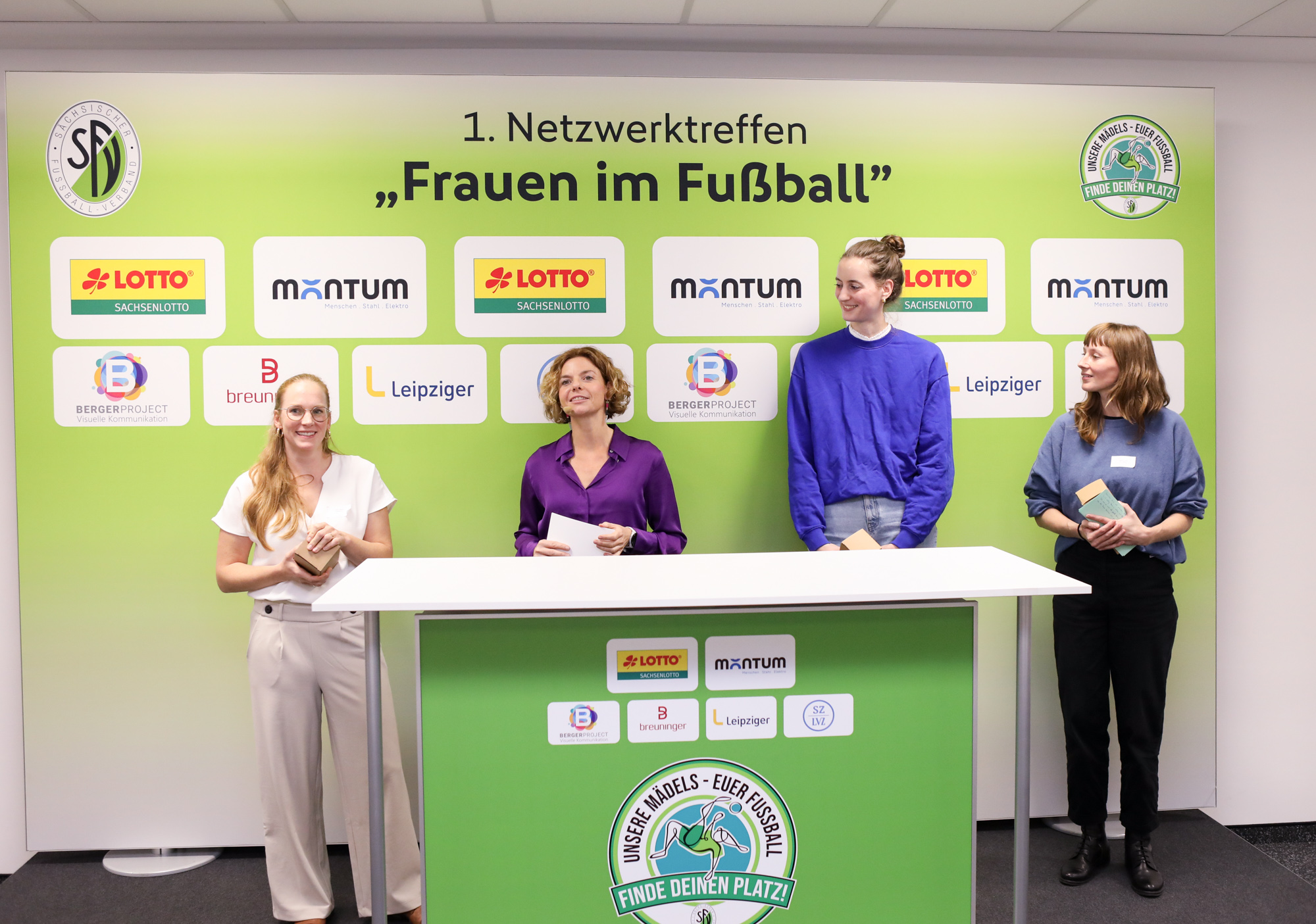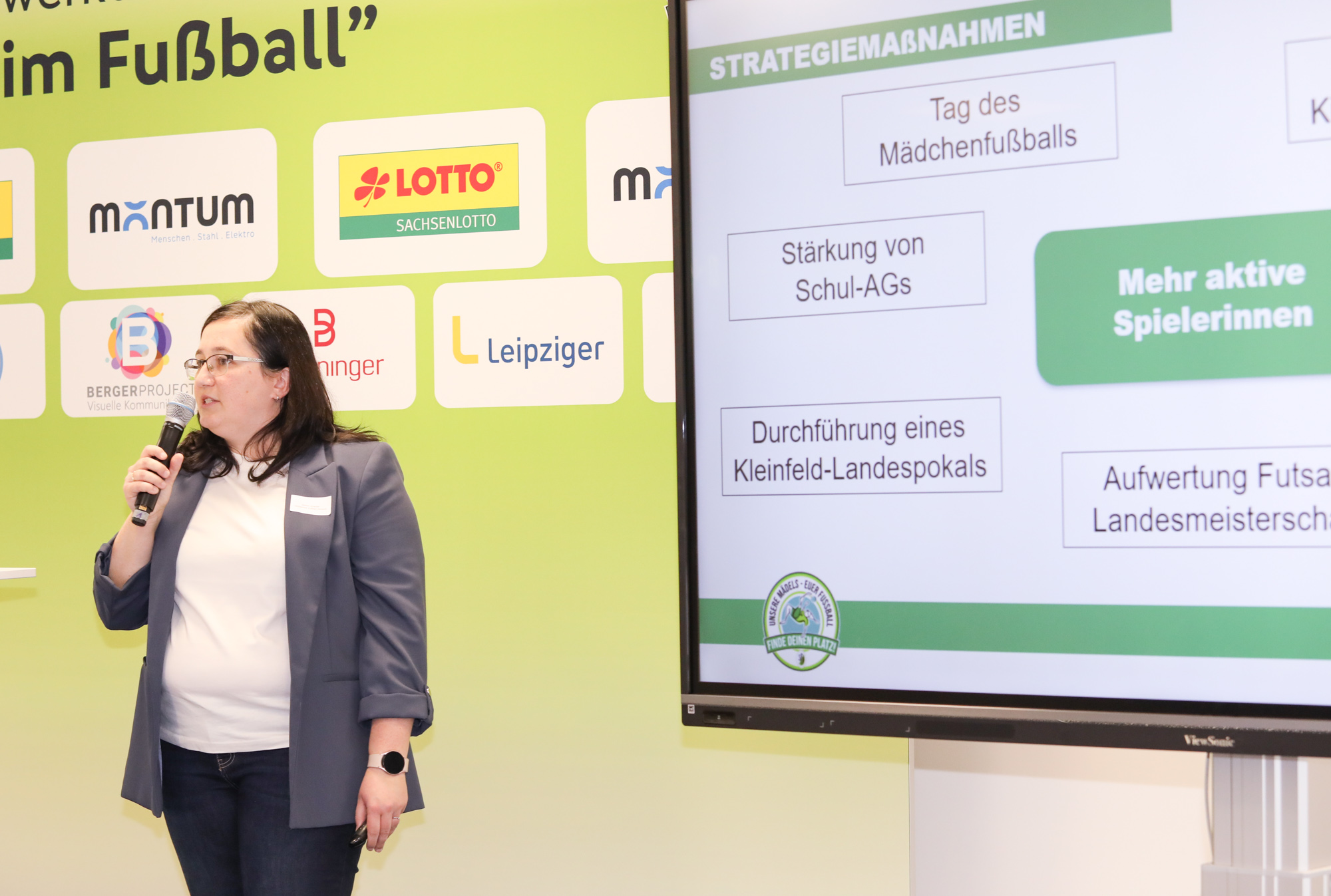 Das Programm war vollgepackt. Nach Impulsvorträgen zur neuen SFV Frauen- und Mädchenstrategie von Madlen Straube und der weiblichen Talentförderung von Katja Greulich und Sophie Mörtlbauer in Sachsen, begrüßte Moderatorin Yvonne Oswald Heike Ullrich (DFB-Generalsekretärin), Viola Odebrecht (Leiterin Frauen- und Mädchenfußball RB Leipzig) und Anja Kunick (ehem. FIFA-Schiedsrichterin) zum Tageshöhepunkt auf der Bühne. Die drei Frauen mit erfolgreichen Karrieren im Fußball blickten auf ihre Laufbahnen zurück, bei der alle die ein oder andere Hürde meistern mussten. Heike Ullrich, die beim DFB-Bundestag am 7. November als Vizepräsidentin kandidiert, sagt: „Wir sind mit 1,5 Millionen weiblichen Mitgliedern zwar auf einem guten Weg und haben auch beim DFB wegweisende Entscheidungen getroffen, allerdings muss es uns noch besser gelingen, vor allem im ländlichen Raum allen Mädchen und Frauen den Zugang zum Fußball in jedem Alter zu ermöglichen. Ich opfere nicht meine Zeit, ich investiere sie. Man braucht einen Antrieb, etwas gestalten zu wollen. Ich möchte Verantwortung übernehmen. 99.5 % der Mitglieder sind im Amateurfußball zu Hause. Das müssen wir uns bewusst machen und auch da müssen wir weiter ansetzen. Gerade mit Kampagnen wie DFB-Assist.“