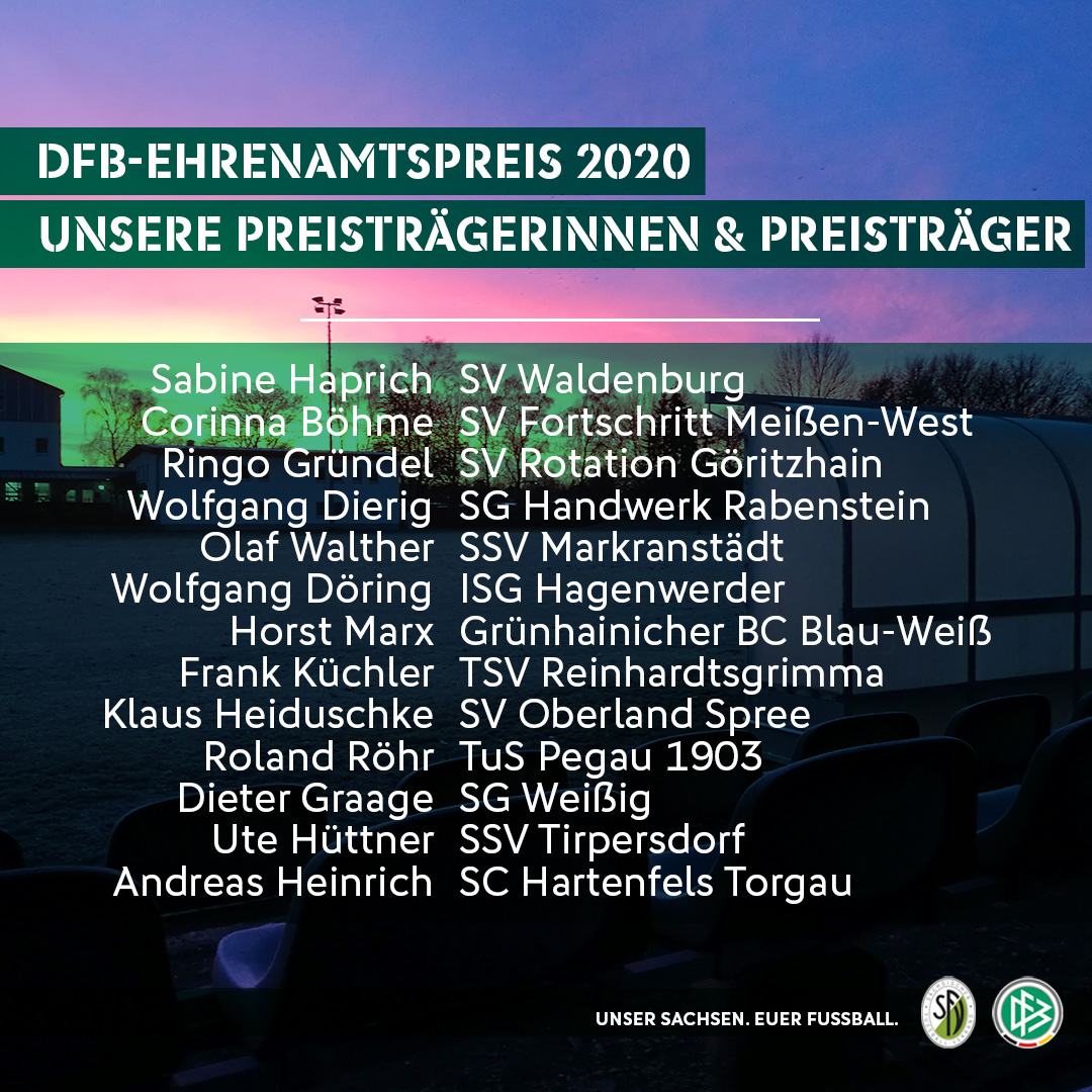 Im Mai wartet auf die 13 Preisträgerinnen und Preisträger ein Wochenende in Dresden. Mit Sabine Haprich, Corinna Böhme, Roland Röhr und Ute Hüttner gehören vier von ihnen noch für ein Jahr zum „Club 100“ und werden im Herbst 2020 zu der Ehrungsveranstaltung im Rahmen eines Länderspiels eingeladen. Außerdem werden alle neuen Club 100 Mitglieder in ihren Vereinen von einem SFV-Präsidiumsmitglied ausgezeichnet und erhalten ihre Präsente.