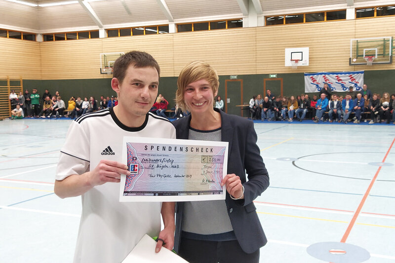 Der Rahmen für die Ehrung des Fair Play-Siegers hätte besser nicht sein können. 300 Zuschauer fanden kurz nach dem Jahreswechsel den Weg in die Turnhalle am Wasserturm zum 5. Super-Cup um den Pokal der Oberbürgermeisterin von Torgau. Auch die SFV Fair Play-Botschafterin Christine Weigelt mischte sich unter die Gäste, um eine erfreuliche Ehrung vorzunehmen. Moderator Norman Wehner (SC Hartenfels Torgau) rief Paul Erdmann in die Hallenmitte und Christine Weigelt gratulierte dem überraschten Kicker zum Fair Play-Sieger des Monats und überreichte den wohlverdienten Check über 250 Euro für Erdmann und seinen Verein SV Mügeln-Ablaß.