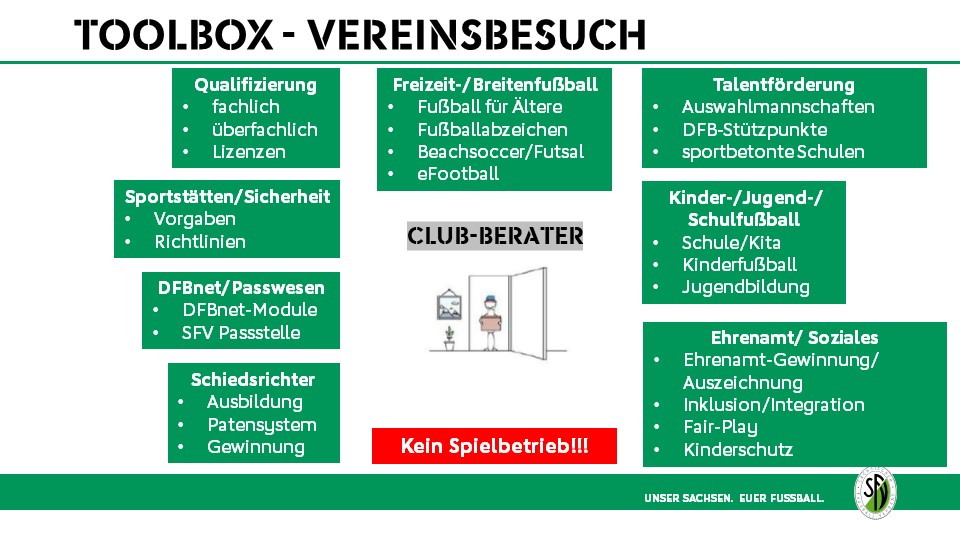 Der Sächsische Fußball-Verband ist nun mit drei Club-Beratern in die Pilotphase gestartet, wobei sich das Angebot zunächst auf Vereine aus den Fußballkreisen Erzgebirge und der Stadt Leipzig beschränkt. Mit André Mäbert, Jorma Depke und Maximilian Ewald schickt der SFV drei Coaches ins Rennen, die viel fußballerisches Know-how aus unterschiedlichen Bereichen mitbringen. In einem Beratungsgespräch zwischen 90 bis max. 120 Minuten stellen ihnen unsere Club-Berater zwei gewünschte Themenschwerpunkte vor, zeigen ihnen die Möglichkeiten auf und nehmen ihre Fragen und Hinweise mit.