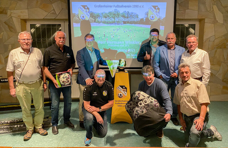 Beim gemeinsamen Gespräch zwischen Hermann Winkler, Tom Prager, Uwe Wiedermann und den Funktionären des Großenhainer FV 1990 kam alles auf den Tisch, was den Verein im Landkreis Meißen bewegt. Mit großer Begeisterung präsentierte der Vereinspräsident Andreas Vogel was in den zurückliegenden Jahren erreicht werden konnte. Mit 362 aktiven Mitgliedern und 18 Mannschaften ist man in der Tat gut aufgestellt. Besonders stolz sind die Großenhainer auf ihre neu formierte Ü 70-Herren Mannschaft, welche vom Urgestein des Vereins Dr. Eckehardt Horn zusammengetrommelt wurde und natürlich auf das Inklusionsteam, welches der Verein in Kooperation mit der Lebenshilfe Großenhain gegründet hat.