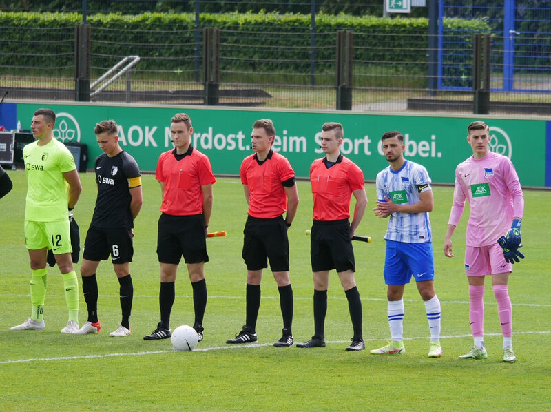 Dabei wurde Schiedsrichter Paul Werrmann (VFC Plauen) an den Seitenlinien von Lucas Leihkauf (SG Jößnitz) und Romano Wehner (SV GW Werrnesgrün) unterstützt, vierter Offizieller war Niclas Rose aus Wismar. Vor knapp 1.500 Zuschauern im Berliner amateurstadion auf dem Olympia-Gelände zog die gastgebende Hertha durch ein 2:0 ins Finale gegen Borussia Dortmund ein. In einem umkämpften Spiel zeigte Paul viermal den gelben und, nach grobem Foulspiel kurz vor Schluss, auch einmal völlig berechtigt den roten Karton für die Gäste. Mit diesem Highlight beendeten die drei jungen Schiris - welche alle in der Spitzenförderung bzw. Coachinggruppe des SFV vertreten sind - eine erfolgreiche Saison in der Junioren-Bundesliga.