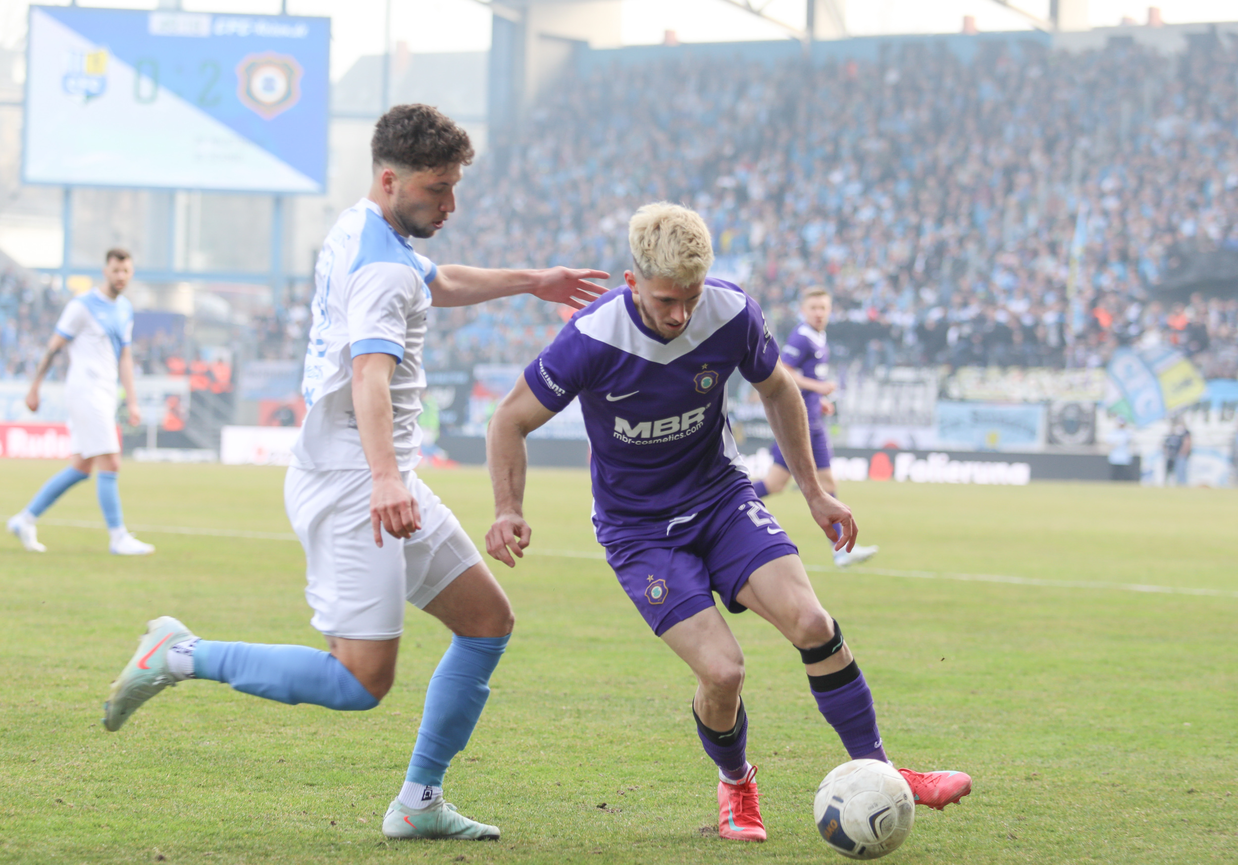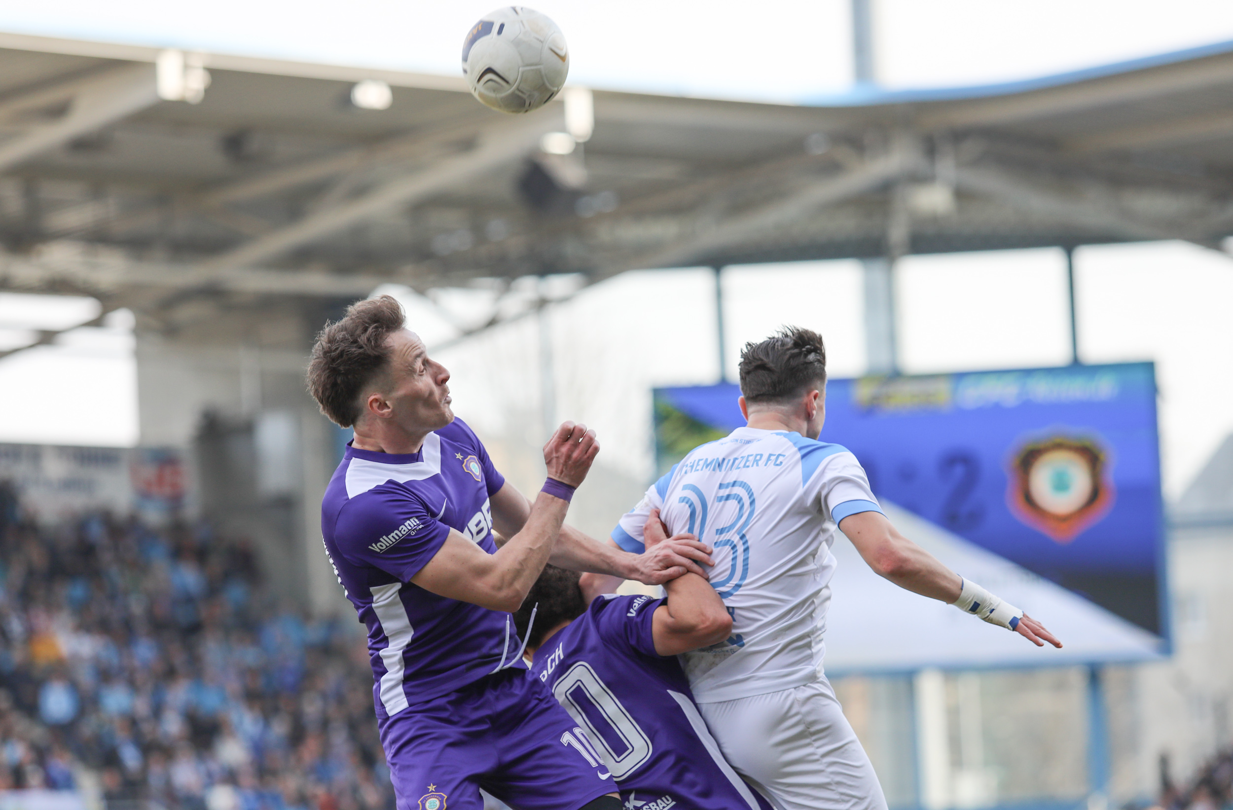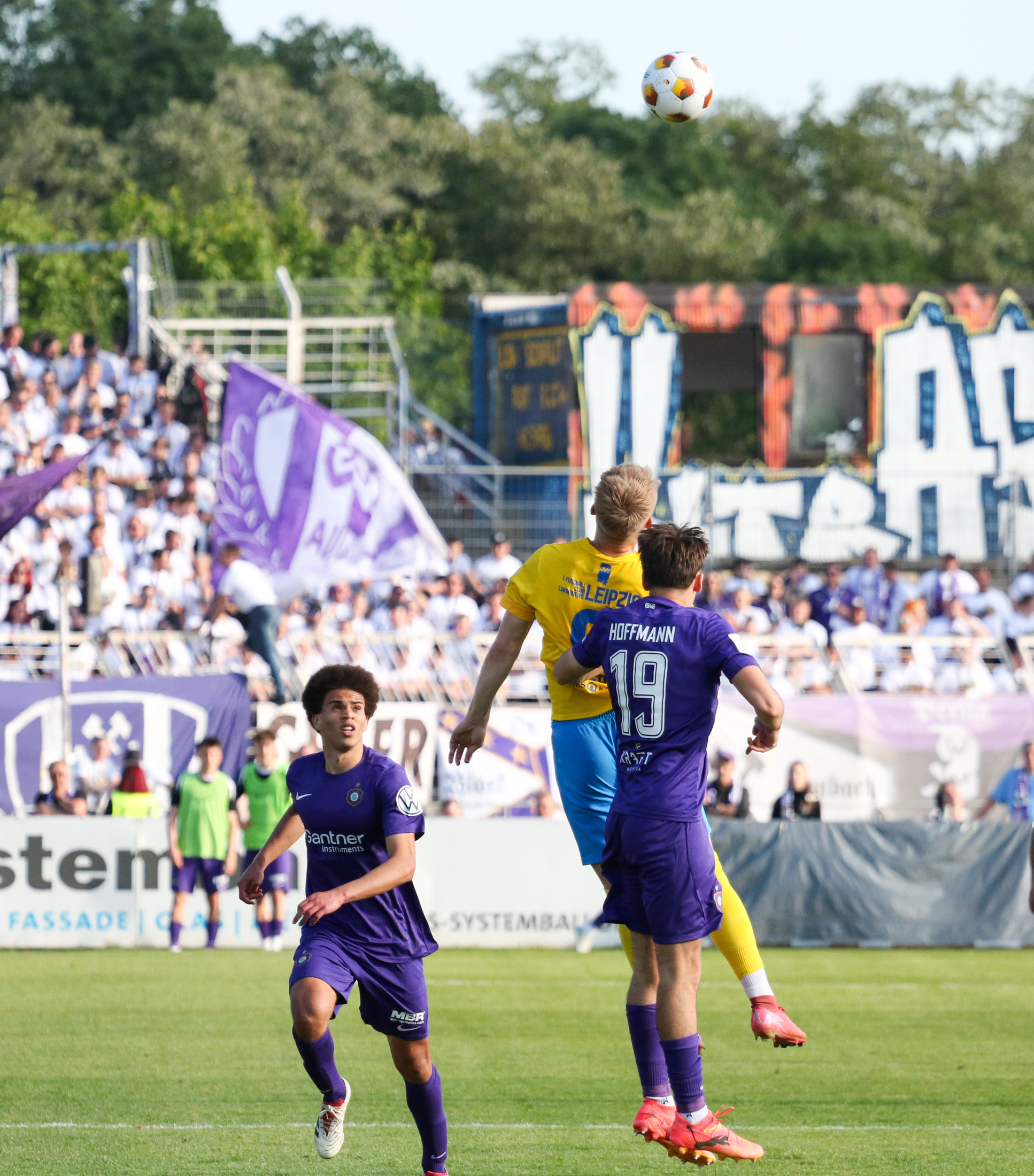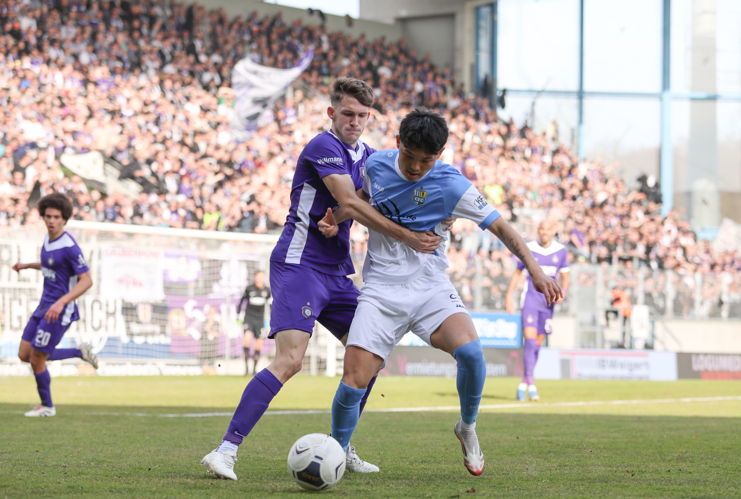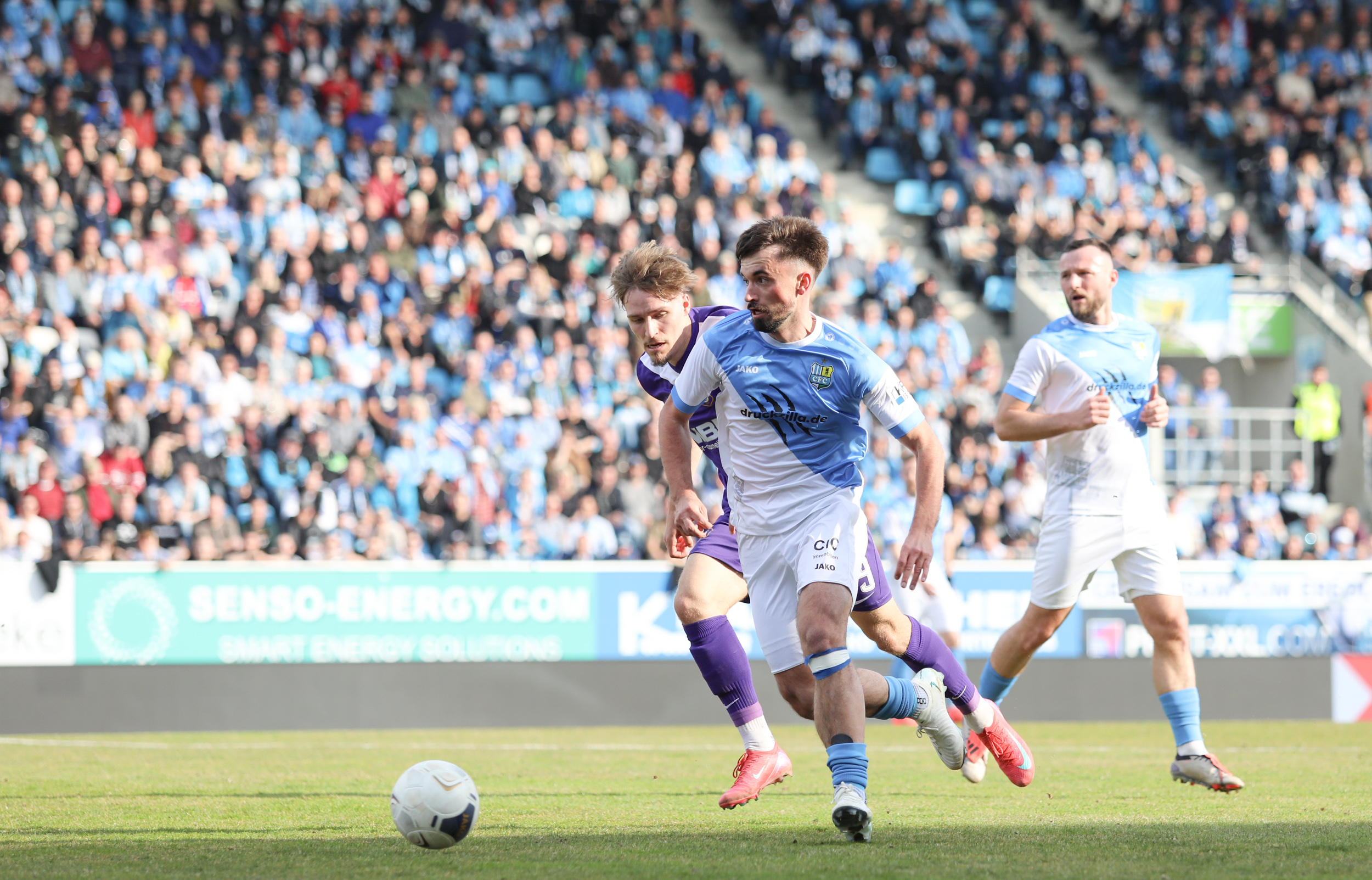 Und auch der FC Erzgebirge Aue wurde seiner Favoritenrolle gerecht. Mit 2:0 feierte der Drittligist einen verdienten Bezirksderby-Sieg vor einer beeindruckenden Kulisse mit knapp 15.000 Zuschauern im Stadion an der Gellertstraße. Besonders in der ersten Hälfte hatte die Mannschaft von Jens Härtel die Himmelblauen im Griff und netzte durch Schmid (26') und Majetschak (29') doppelt. Im zweiten Durchgang investierte der CFC mehr, hatte auch ein paar Abschlüsse und einmal rettete die Latte für den geschlagenen Männel, insgesamt brachte der CFC die Lila-Weißen nur selten in Verlegenheit.