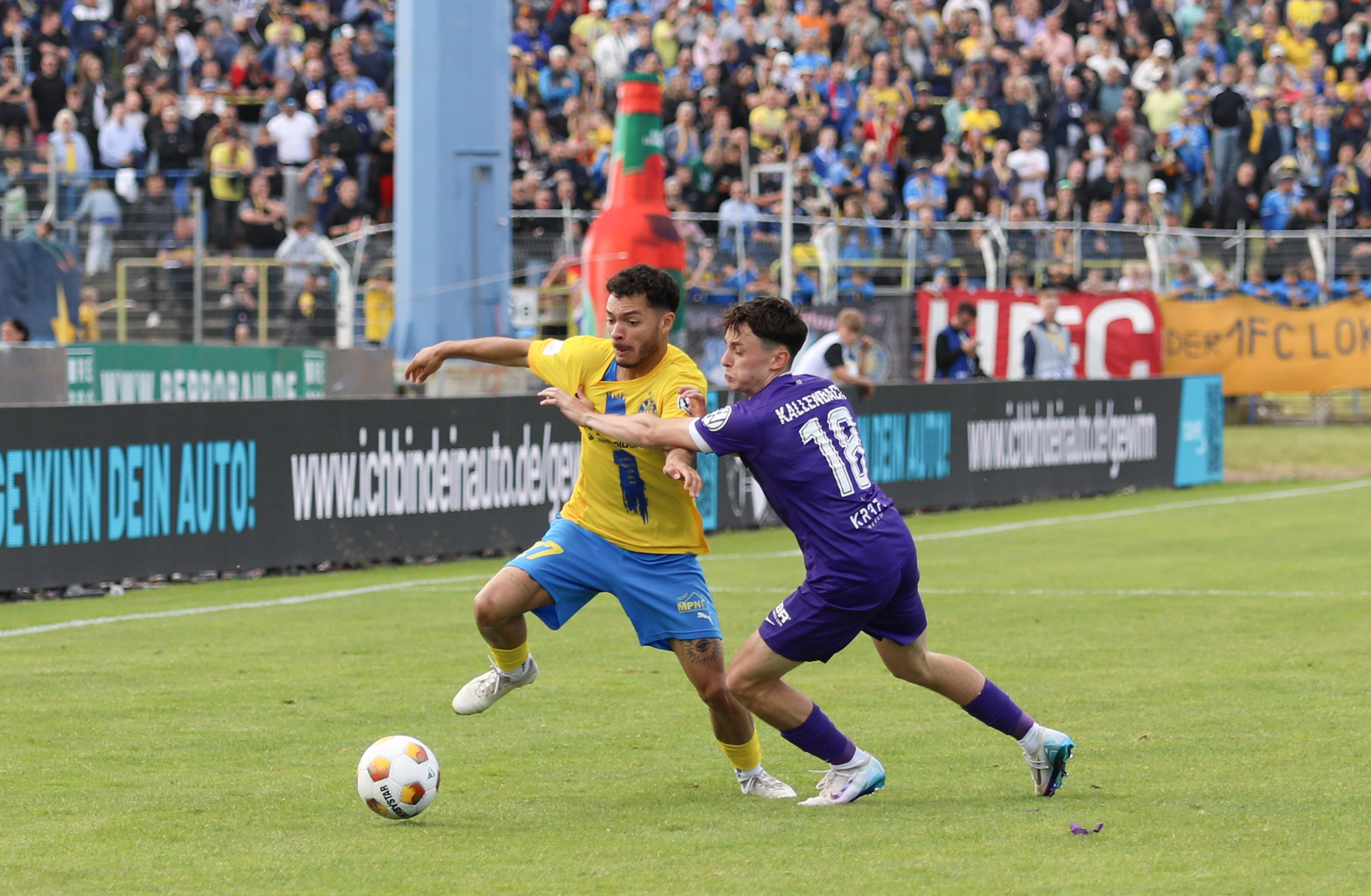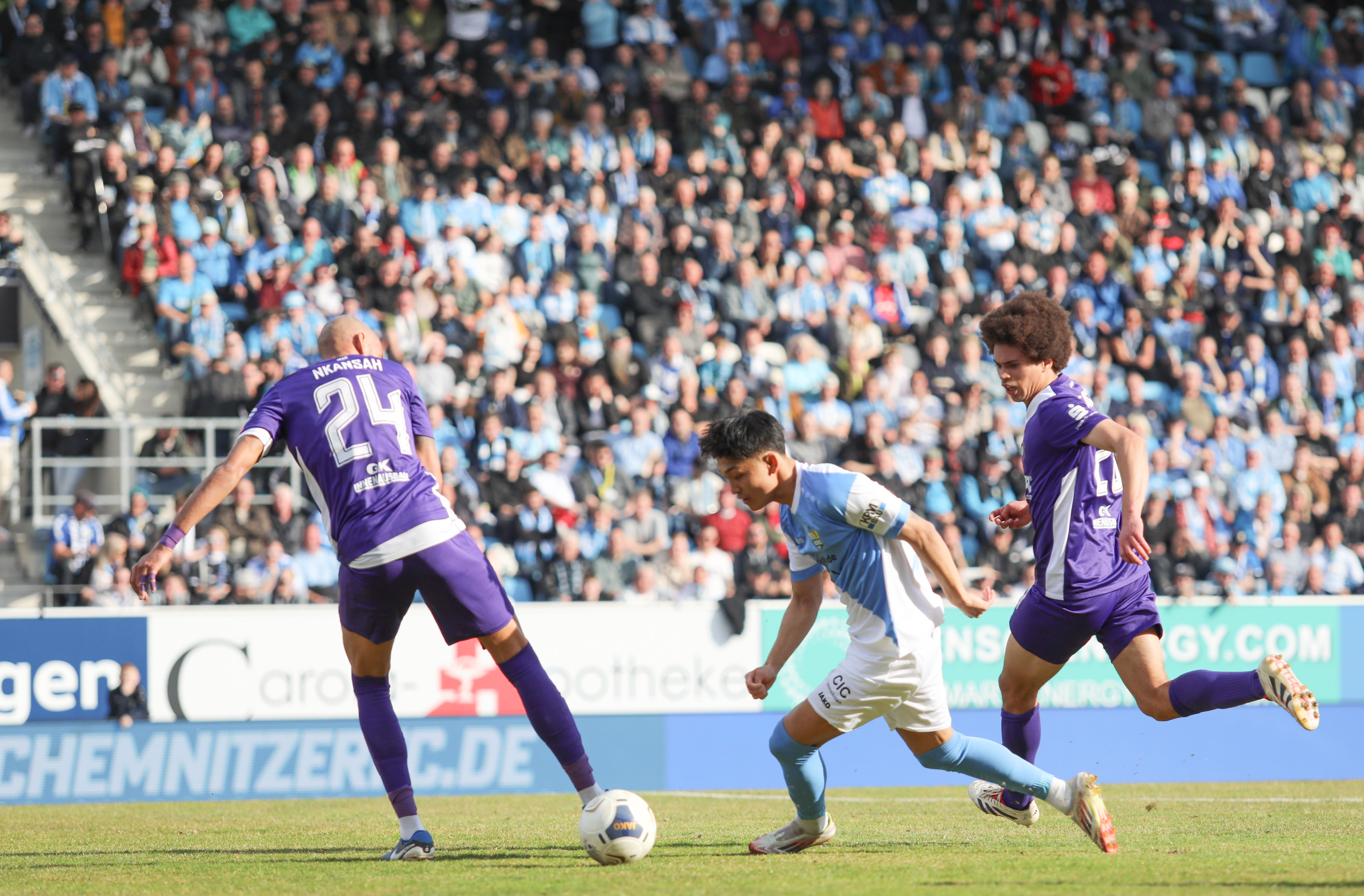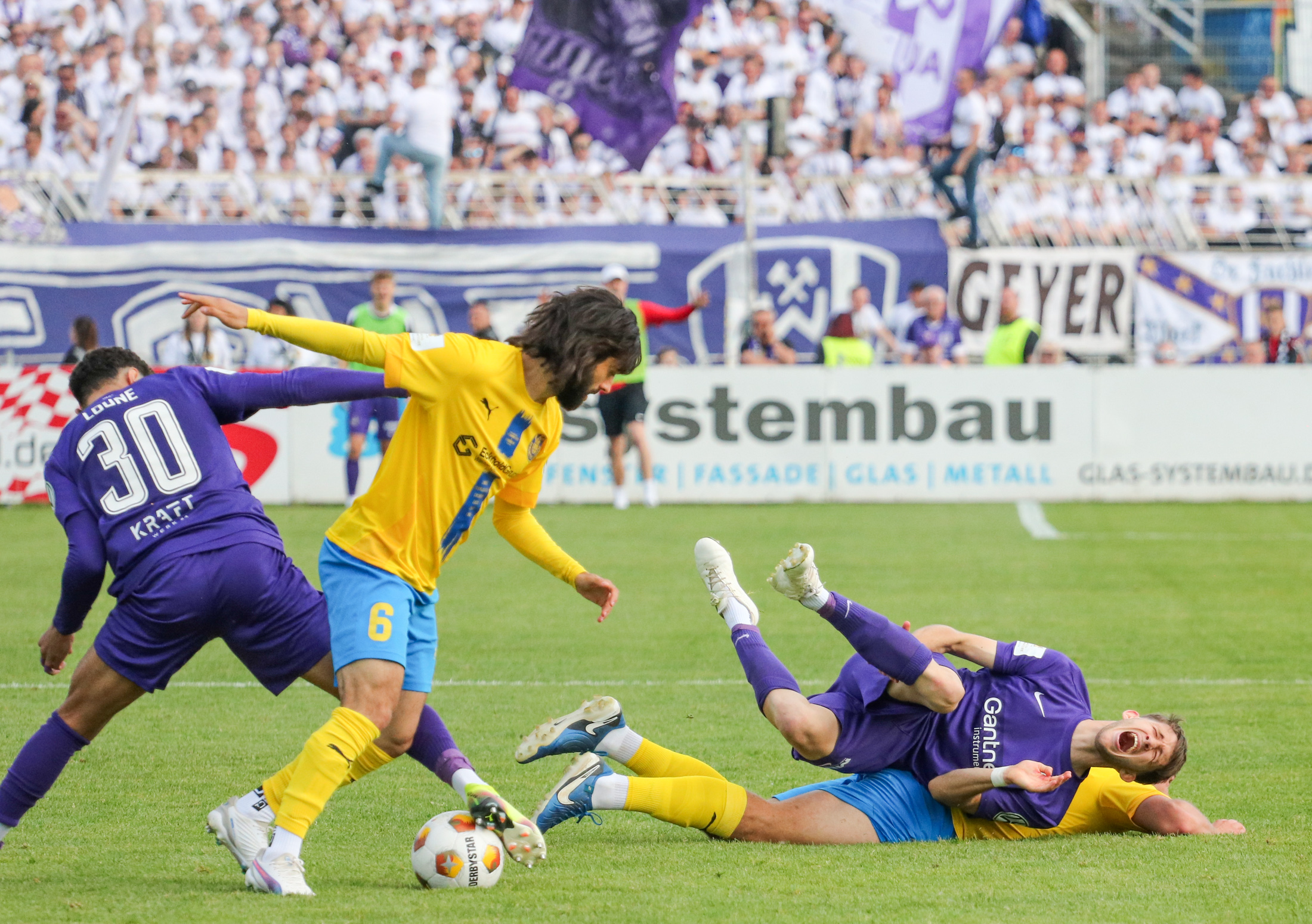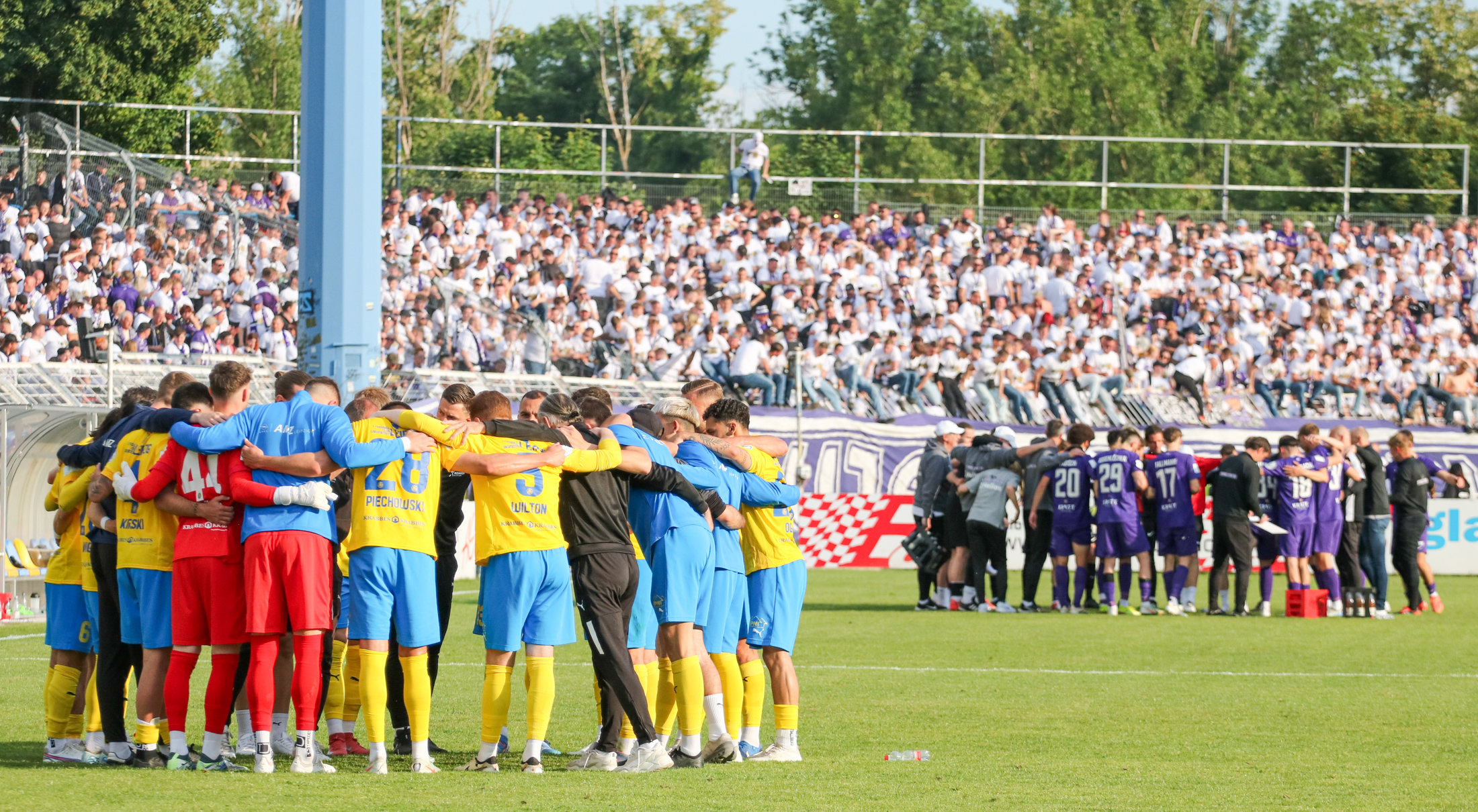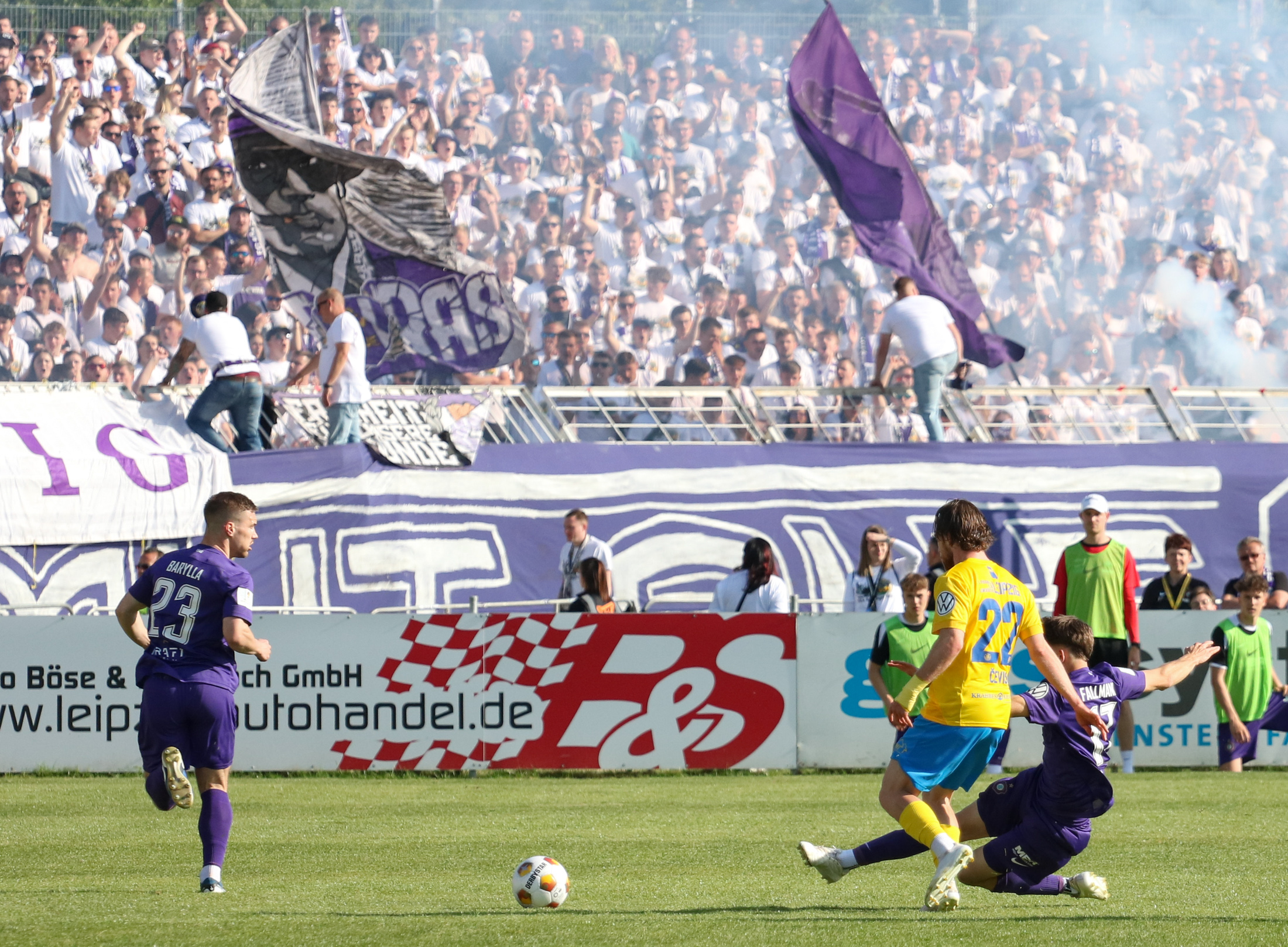 Und auch der FC Erzgebirge Aue wurde seiner Favoritenrolle gerecht. Mit 2:0 feierte der Drittligist einen verdienten Bezirksderby-Sieg vor einer beeindruckenden Kulisse mit knapp 15.000 Zuschauern im Stadion an der Gellertstraße. Besonders in der ersten Hälfte hatte die Mannschaft von Jens Härtel die Himmelblauen im Griff und netzte durch Schmid (26') und Majetschak (29') doppelt. Im zweiten Durchgang investierte der CFC mehr, hatte auch ein paar Abschlüsse und einmal rettete die Latte für den geschlagenen Männel, insgesamt brachte der CFC die Lila-Weißen nur selten in Verlegenheit.