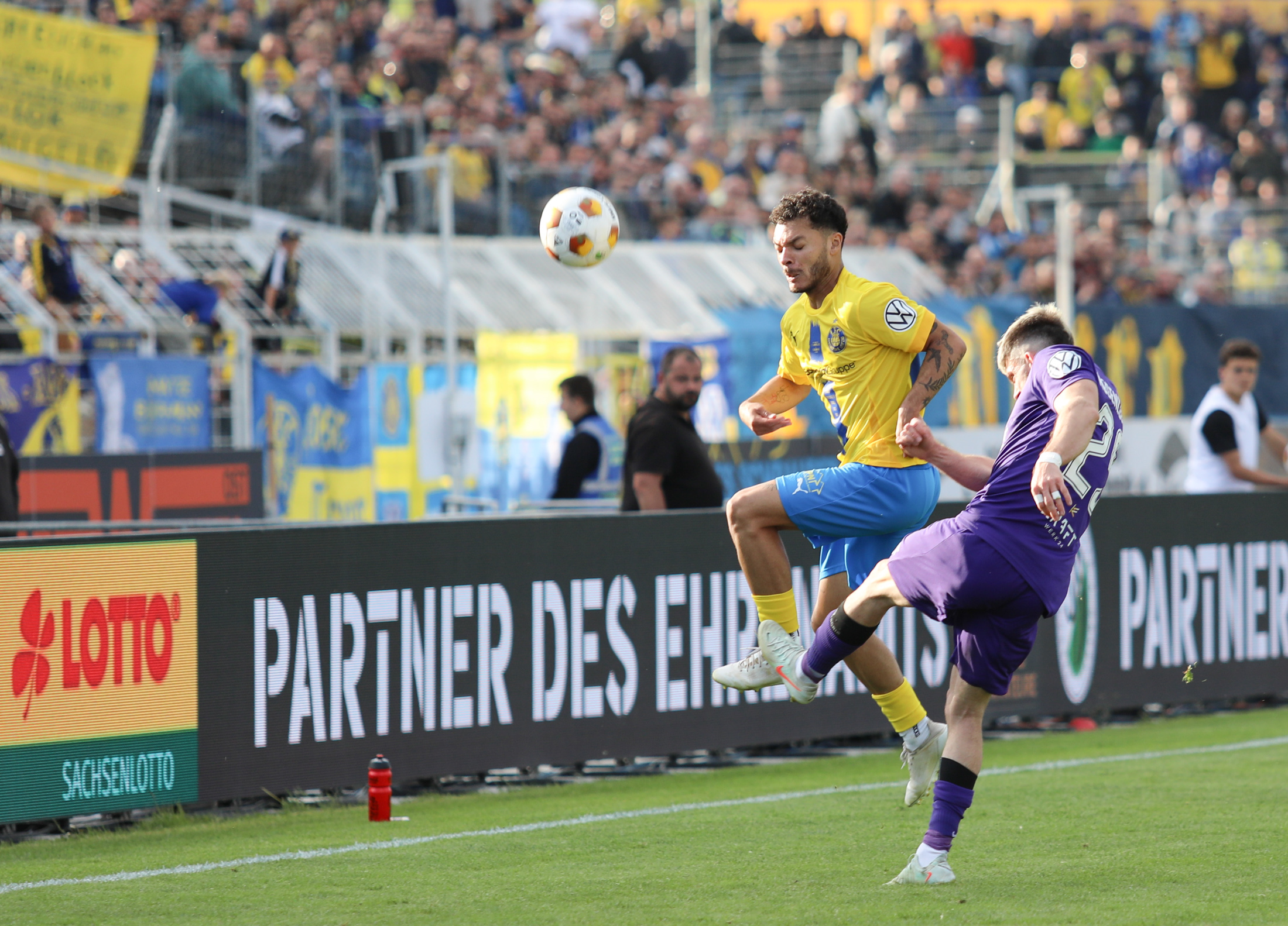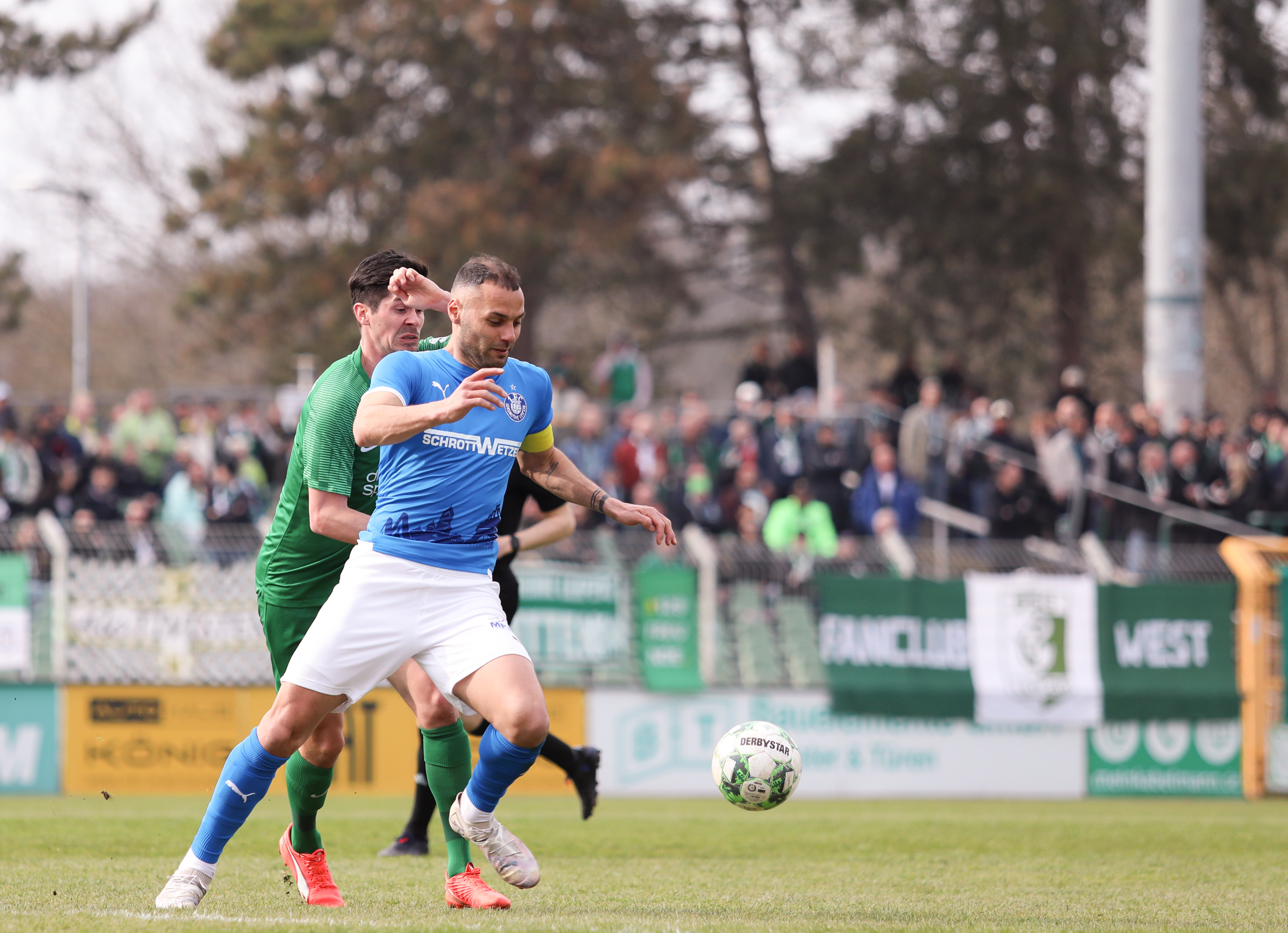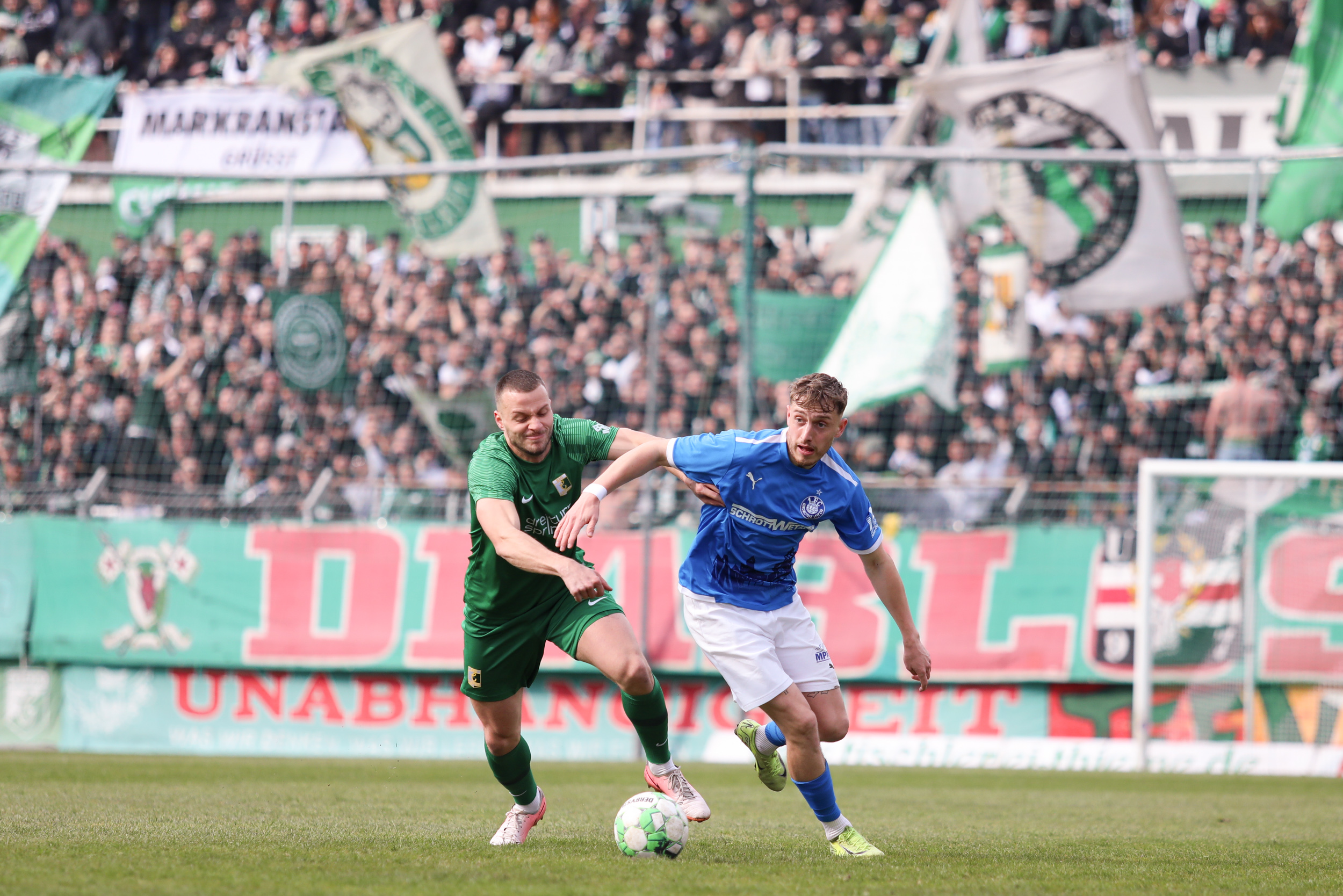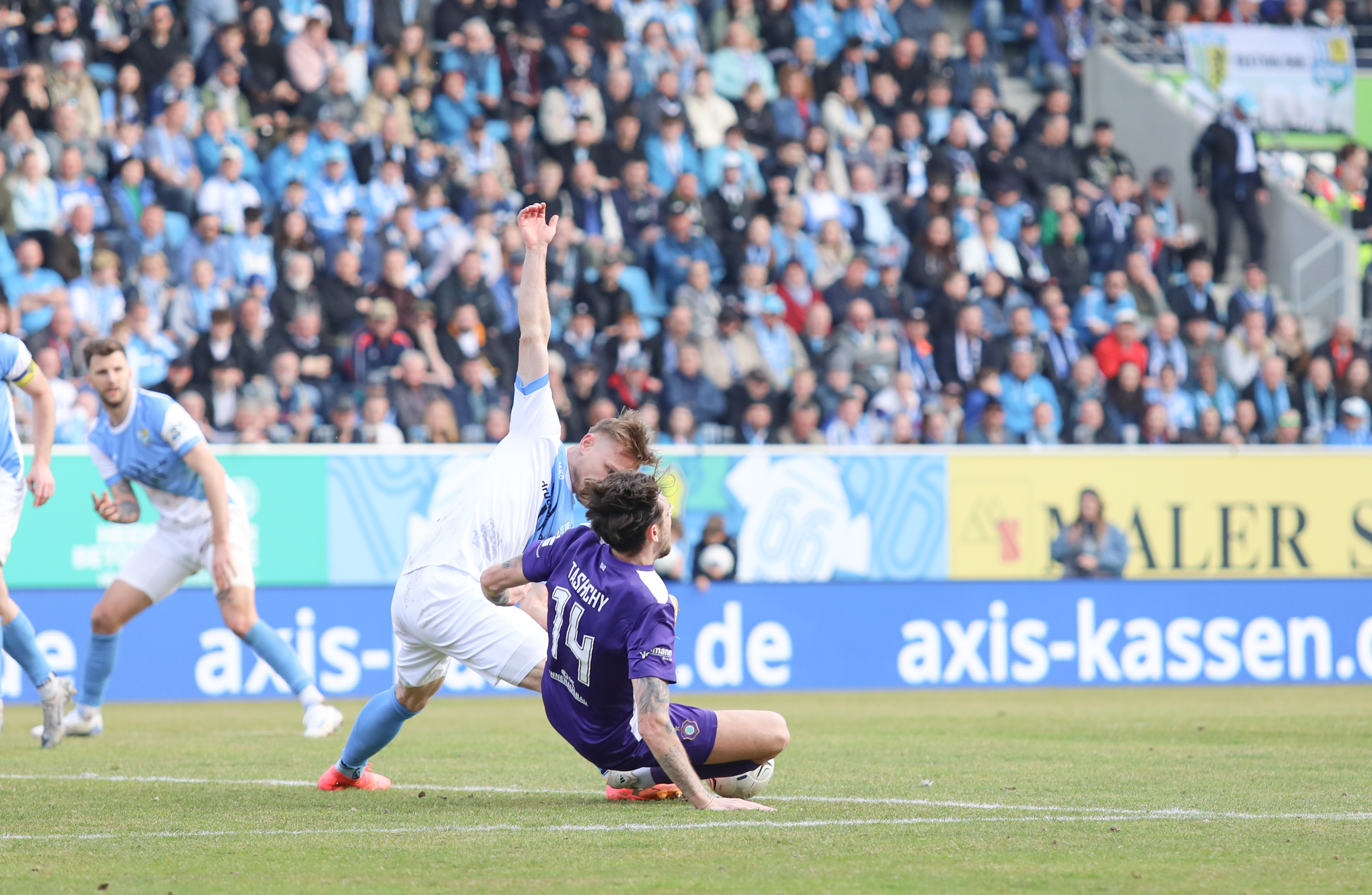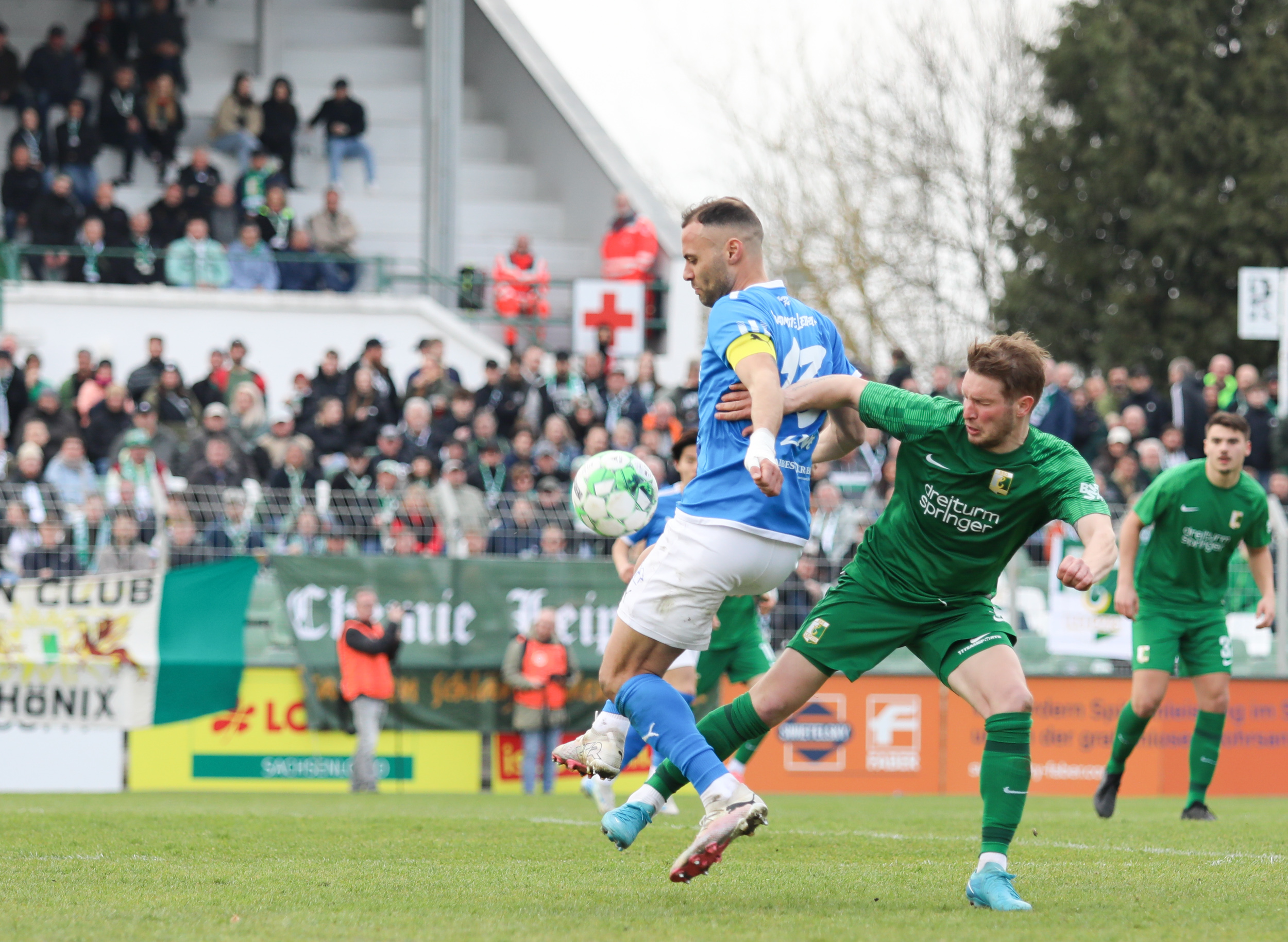 Und auch der FC Erzgebirge Aue wurde seiner Favoritenrolle gerecht. Mit 2:0 feierte der Drittligist einen verdienten Bezirksderby-Sieg vor einer beeindruckenden Kulisse mit knapp 15.000 Zuschauern im Stadion an der Gellertstraße. Besonders in der ersten Hälfte hatte die Mannschaft von Jens Härtel die Himmelblauen im Griff und netzte durch Schmid (26') und Majetschak (29') doppelt. Im zweiten Durchgang investierte der CFC mehr, hatte auch ein paar Abschlüsse und einmal rettete die Latte für den geschlagenen Männel, insgesamt brachte der CFC die Lila-Weißen nur selten in Verlegenheit.