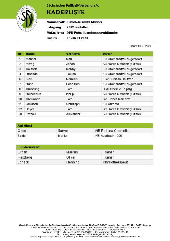 Die sächsische Futsal-Landesauswahl (2. Platz) beim 4. NOFV Futsal-Länderpokal 2019/2020.  vorne v.l.n.r.: Leon B. Hahn, Sarwar Osse, Tom Gründling, Robby Golzsch, Karl Männel, Yannic Voigt, Tom Grellmann hinten v.l.n.r.: Oliver Herzberg, Marleen Schmidt, Philip Heineccius, Norman Kloß, Moritz Seidel, Alexander Petzold, Jonas Mittag, Tom Beyer, Marcus Urban © Unknown iPhone Mit dem 2. Platz und nur einer Niederlage gegen Berlin kehrt die sächsische Futsal-Landesauswahl aus Bad Blankenburg zurück.