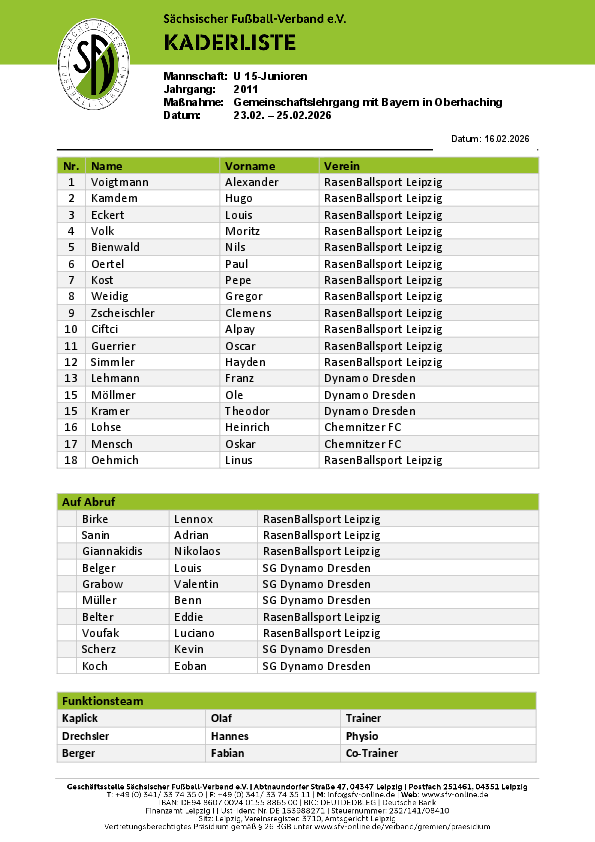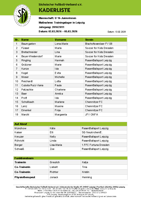 U 16-Juniorinnen Termine 2025/2026 Datum Maßnahme Ort Kader 2026 02.03.-05.03. Sondertrainingslager Leipzig Kader 25.03.-29.03. DFB-ST Duisburg 25.09. - 27.09. GL…
