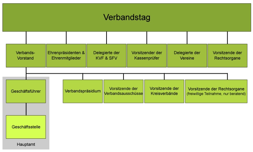 Ohne die unzähligen ehrenamtlichen Helfer auf und neben dem Platz wäre an einen geregelten Spielbetrieb überhaupt nicht zu denken. Egal ob im Verein, auf Kreis- oder Verbandsebene - ohne das Ehrenamt geht nichts! Das Höchste Beschlussorgan des SFV bildet die Mitgliederversammlung, der sogenannte "Verbandstag". Oberster Repräsentant des Verbandes ist der Präsident. Ihm obliegt die Gesamtverantwortung und die Richtlinienkompetenz. Neben dem Präsidenten bilden vier Vizepräsidenten, der Schatzmeister und der Geschäftsführer das SFV-Präsidium. Das Präsidium wird ebenso wie die Vorsitzenden der Aussschüsse vom Verbandstag gewählt. Beide Gremien bilden zusammen mit den Präsidenten der Kreisverbände den Verbandsvorstand.